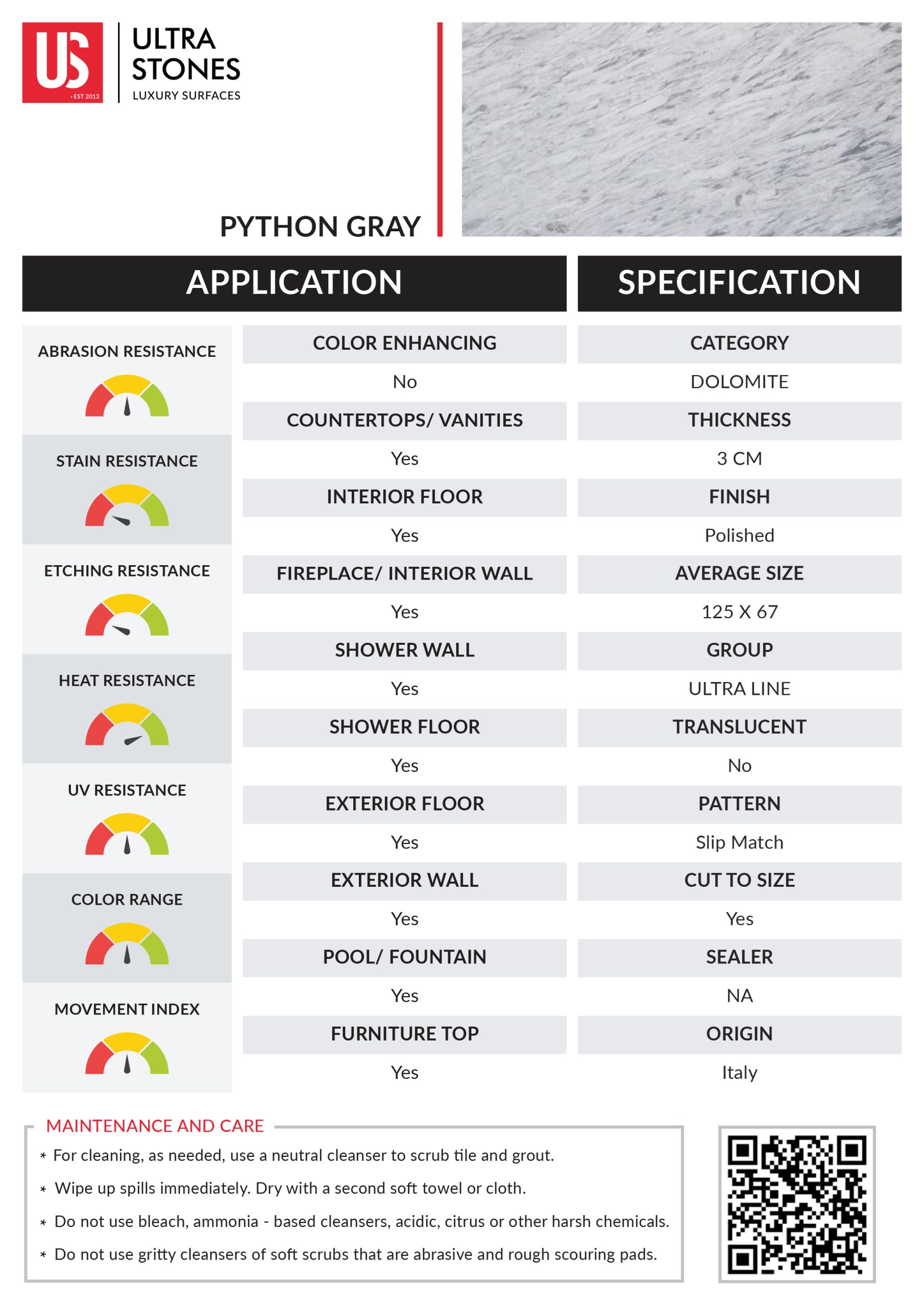 Python Gray is a classic dolomite. Characterized by a light grey background mottled with deep grey highlights, this stone offers a rich monochromatic depth to any setting. Its superior durability makes Python Gray suitable for both indoor and outdoor applications. Its dynamic look makes spaces look visually captivating.