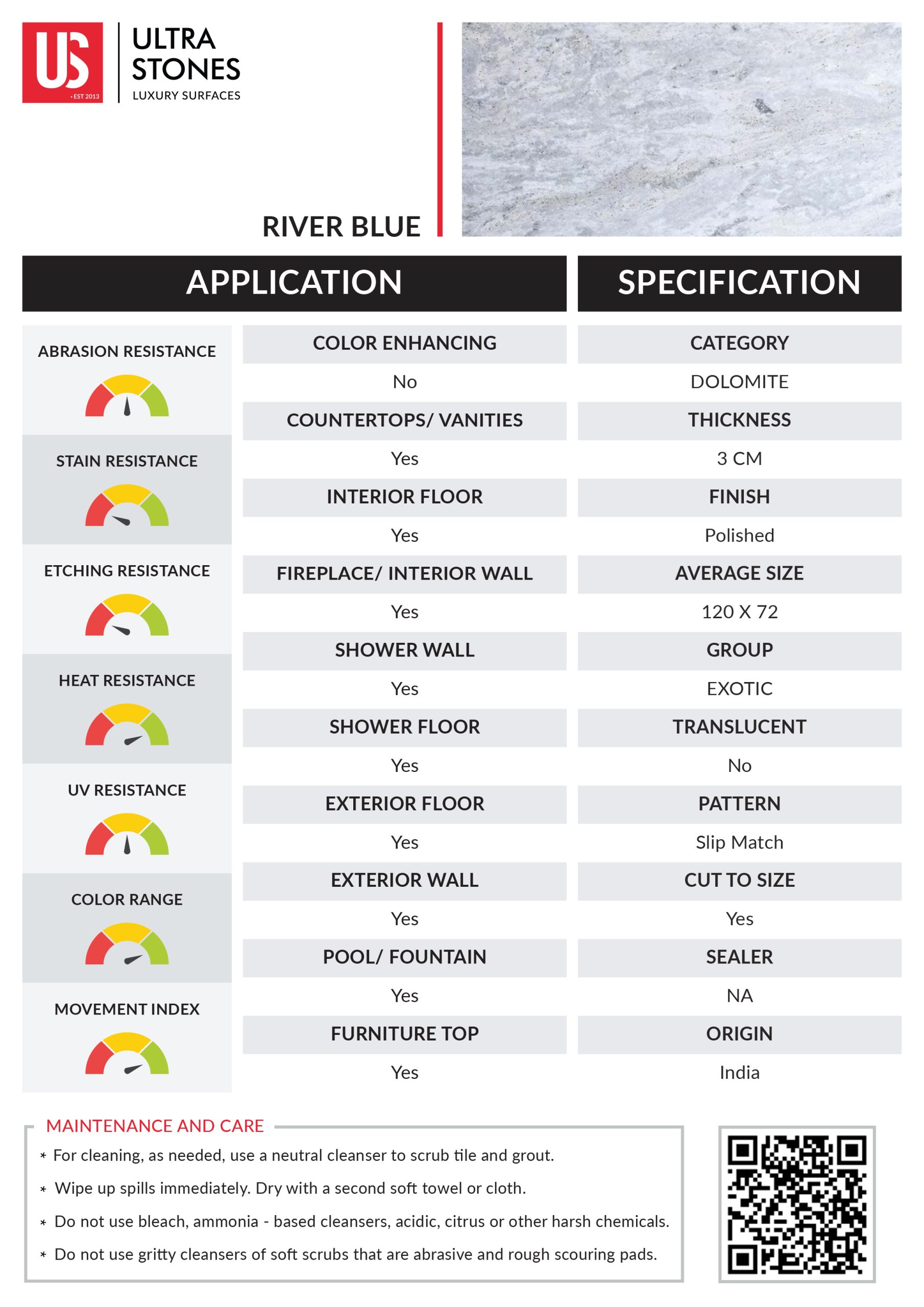 River Blue is one of the most desired dolomite surfaces prized for its unmatched beauty and strength. Characterized by a bluish-grey background, this stone is a popular choice for creating dynamic flooring, countertops, and bathroom surfaces. Subtle beige and white swirls give the stone a delightful contrast, making it suitable for a variety of design aesthetics.