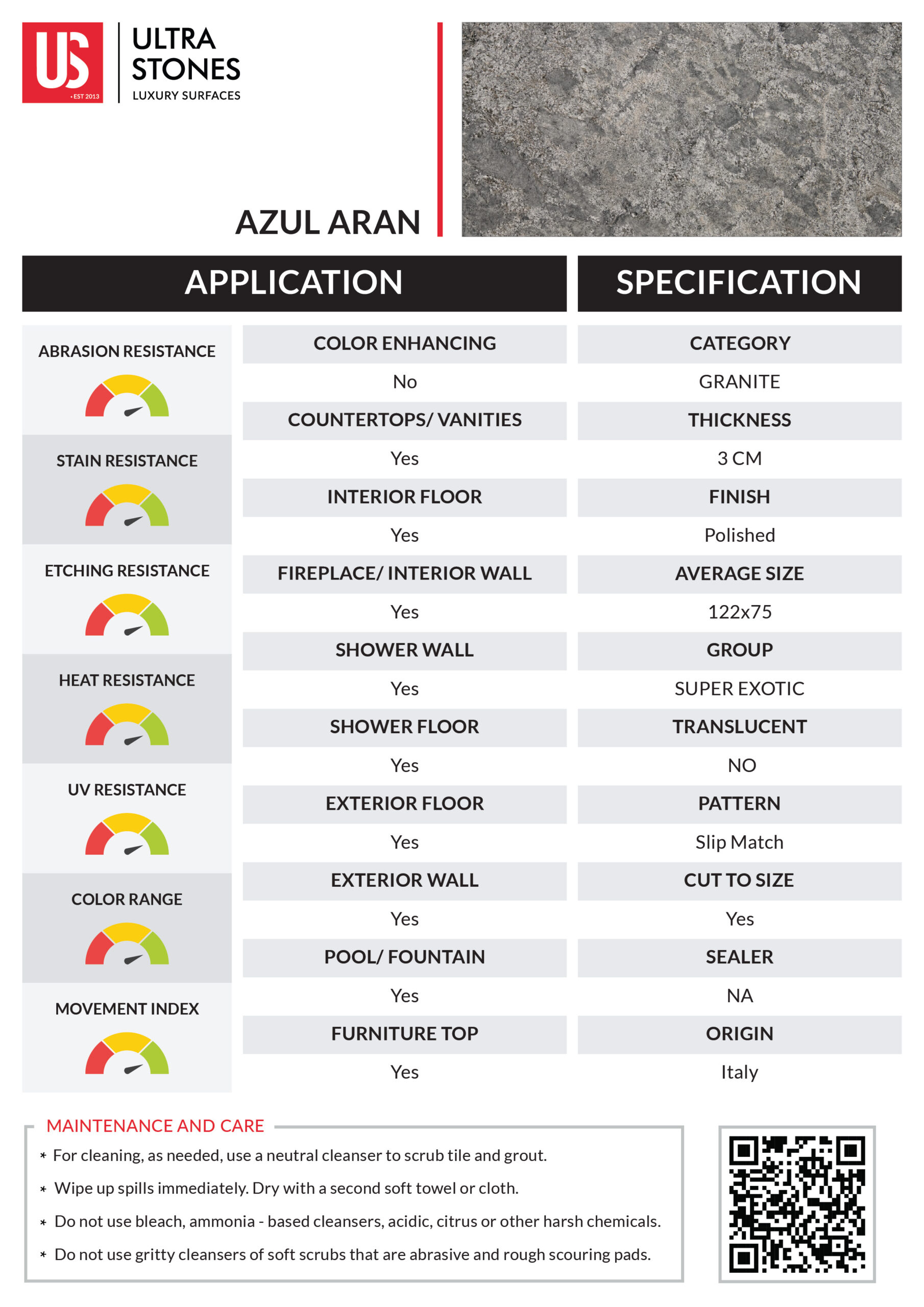Azul Aran is a premium granite quarried in Italy. Its cool tones and exceptional durability make it suitable for both residential and commercial spaces. It features a deep slate-gray surface highlighted by silver and beige grainy clusters, creating a stunning contrast and elegant appearance.