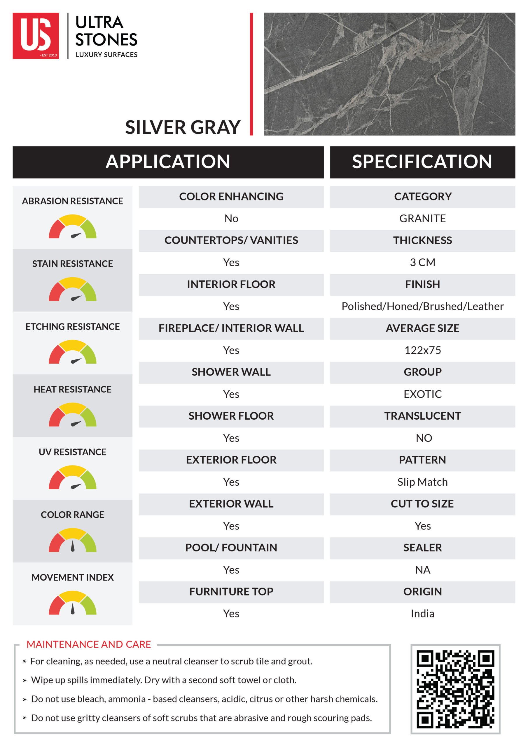 Silver Gray granite is a perfect choice for designing creative spaces. It features a solid grey surface speckled with silver mineral inclusions and intricate silver patterns that add visual interest to the stone’s appearance. Whether you are designing a residential or commercial space, Silver Grey granite can add visual depth and character to any design with its dramatic appearance.