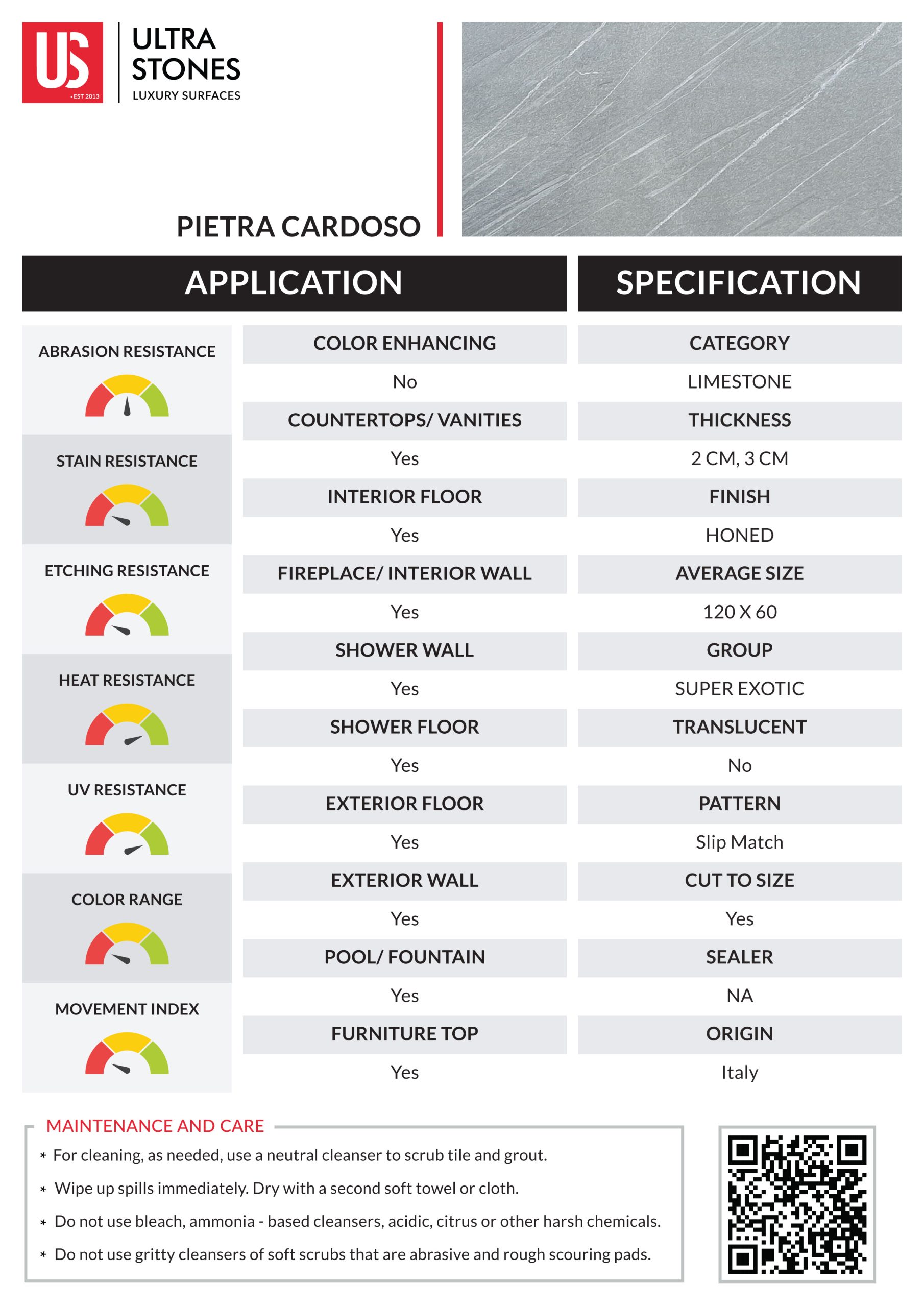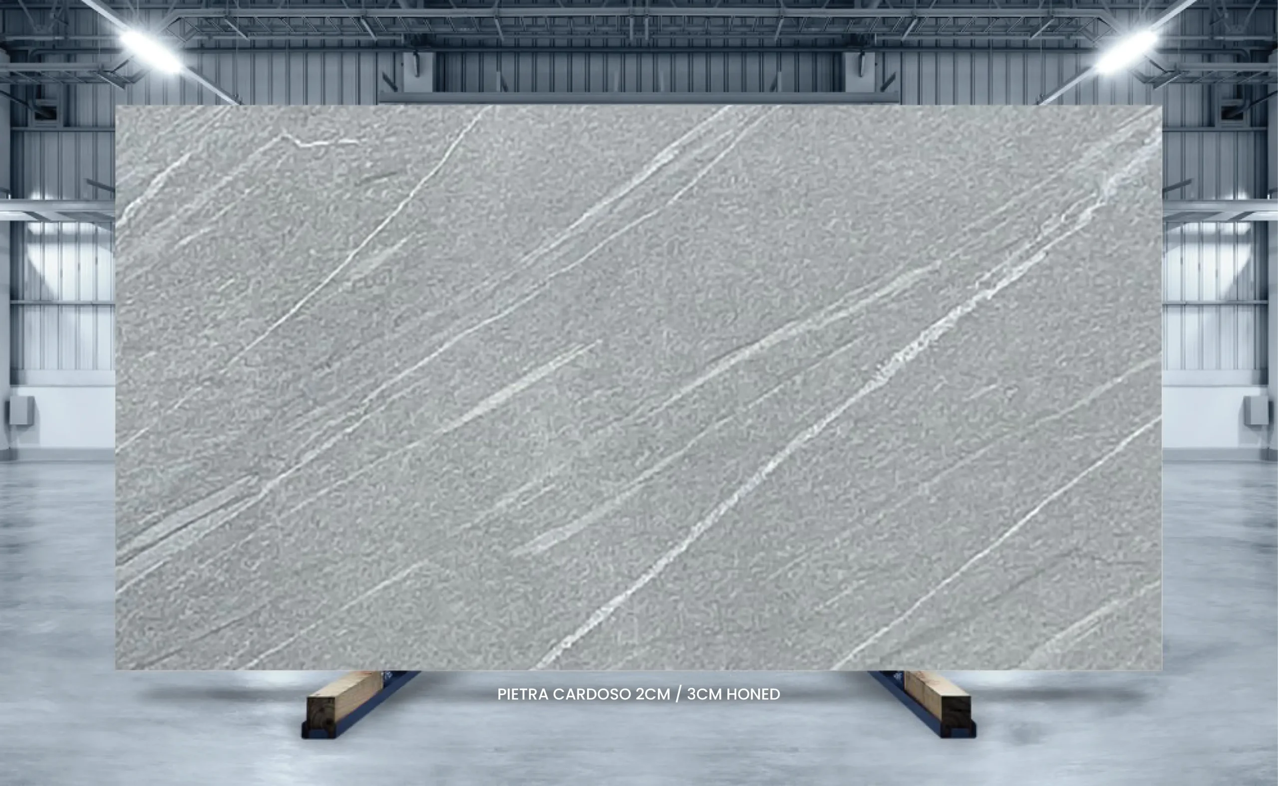 Pietra Cardoso is coveted for its earthy palette and durability. It features a light slate gray surface highlighted by occasional white calcite veins, adding visual depth to the stone’s appearance. The cool palette of Pietra Cardoso blends into various design styles, bringing serene and rustic vibes to any setting.