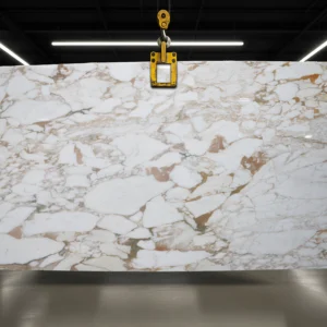Calacatta Vagli Oro marble features a soft, warm white background with veins in golden-brown and grey hues. Some slabs also showcase brecciated patterns. When installed as modern kitchen countertops, accent walls, vanity tops, or other interior applications, this classic Italian marble offers a unique look to both indoor and outdoor areas, making spaces feel more inviting. Its polished surface lends a sleek, modern appeal that elevates any interior style.