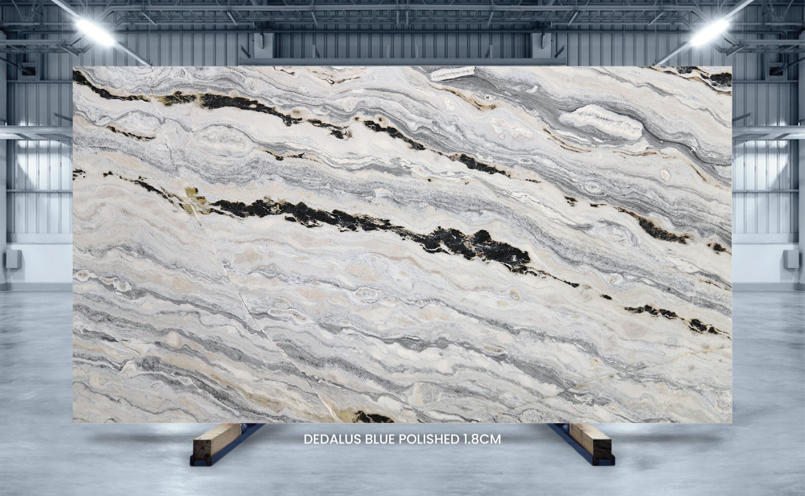 Dedalus Blue marble features striking contrasts of bluish-grey, black, and creamy white veins flowing across the slab. The stone evokes a sense of movement and depth through a perfect interplay of timeless, classic palettes. It is an excellent addition to contemporary fireplace surrounds, kitchen countertops, and accent walls. Bring a vibrant look to your spaces with this exotic piece of marble.