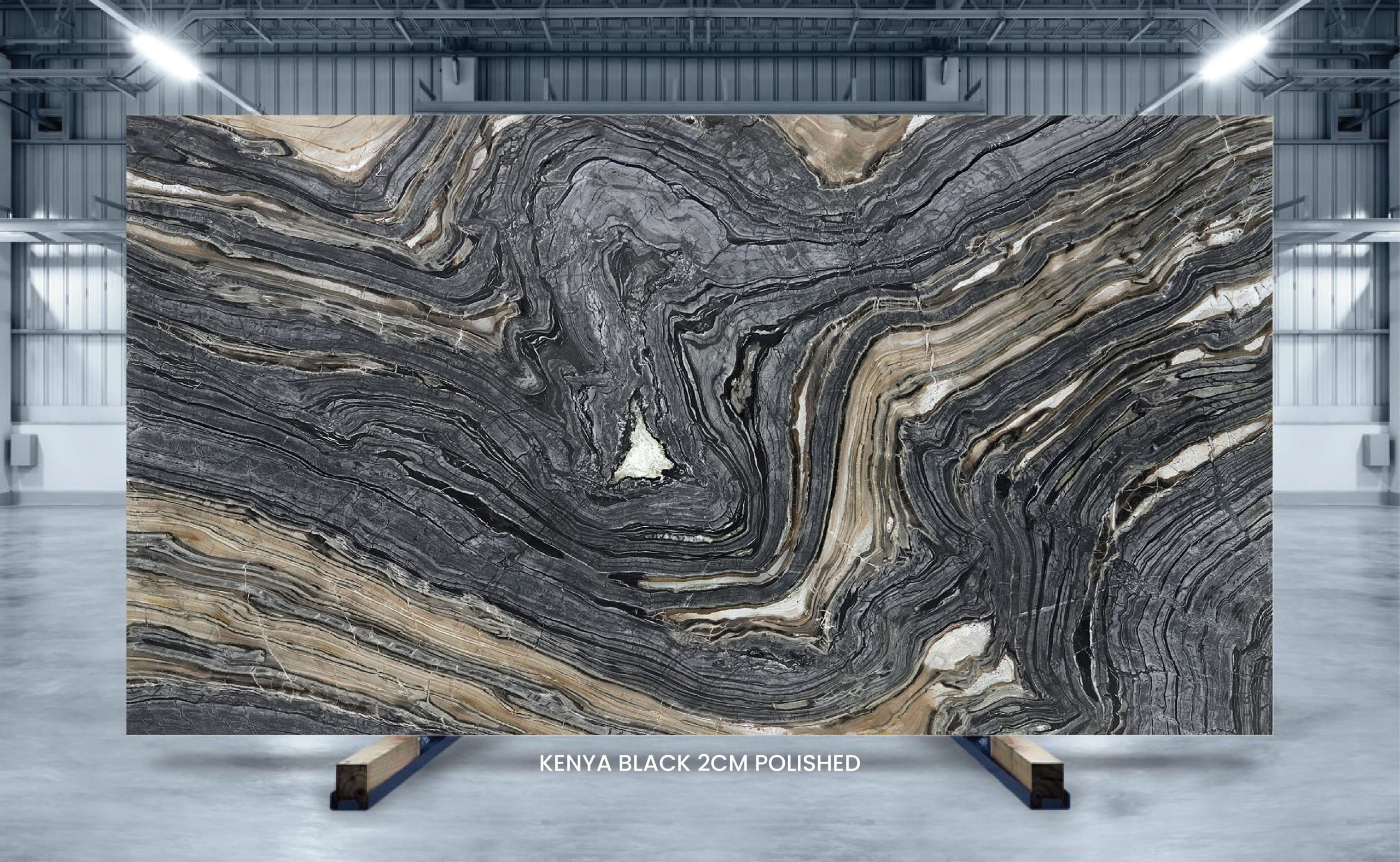 Kenya Black marble features dramatic veining in black, beige, and grey tones. Its striking patterns and rich contrast add visual intrigue to accent walls, countertops, and other decorative features. Dramatic and durable, this Italian marble elevates the aesthetic and functionality of both residential and commercial interiors.