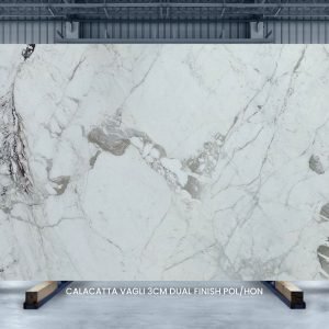 Calacatta Vagli marble features a warm white surface with subtle golden undertones. Taupe and grey veins further elevate its natural appeal, making it a sought-after choice for countertops, backsplashes, flooring, and accent walls. Its delicate warm tones, paired with wooden cabinets or furniture pieces, give any kitchen or living room a cozy and elegant makeover.