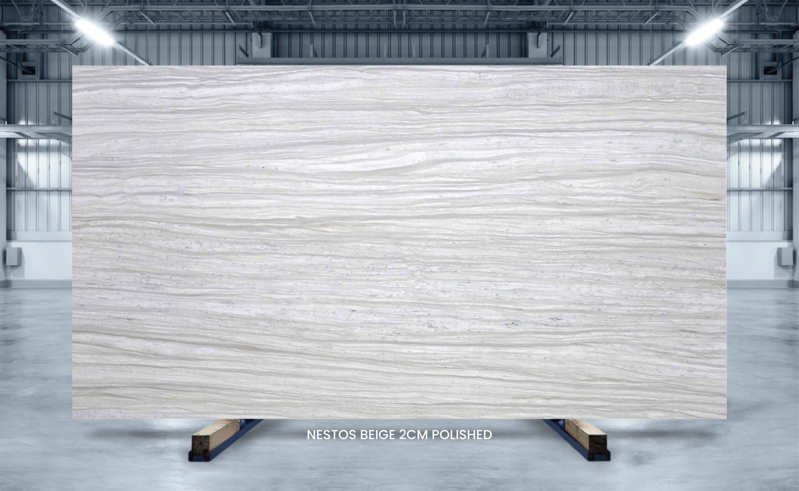 Nestos Beige marble features linear grey and beige veins strewn across its surface, offering a serene appeal to both residential and commercial spaces. Quarried in Greece, this classic marble exudes a cool, sophisticated aesthetic. Its versatility makes it suitable for both indoor and outdoor applications, brightening up spaces with its refined hues and timeless charm.
