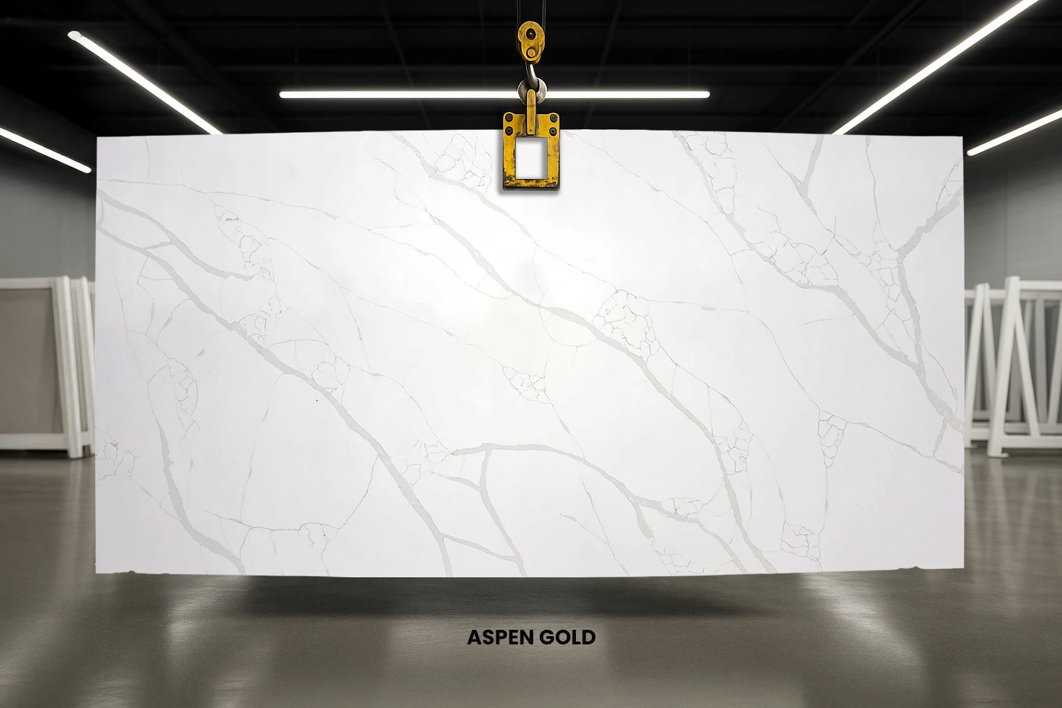 Aspen Gold quartz exudes the timeless charm of natural marble with a clean white background and elegant grey and golden veins. Thick and pencil veins weave together into tasteful patterns similar to those of marble. In addition to its premium appearance, its durability makes this quartz a perfect choice for high-traffic areas.