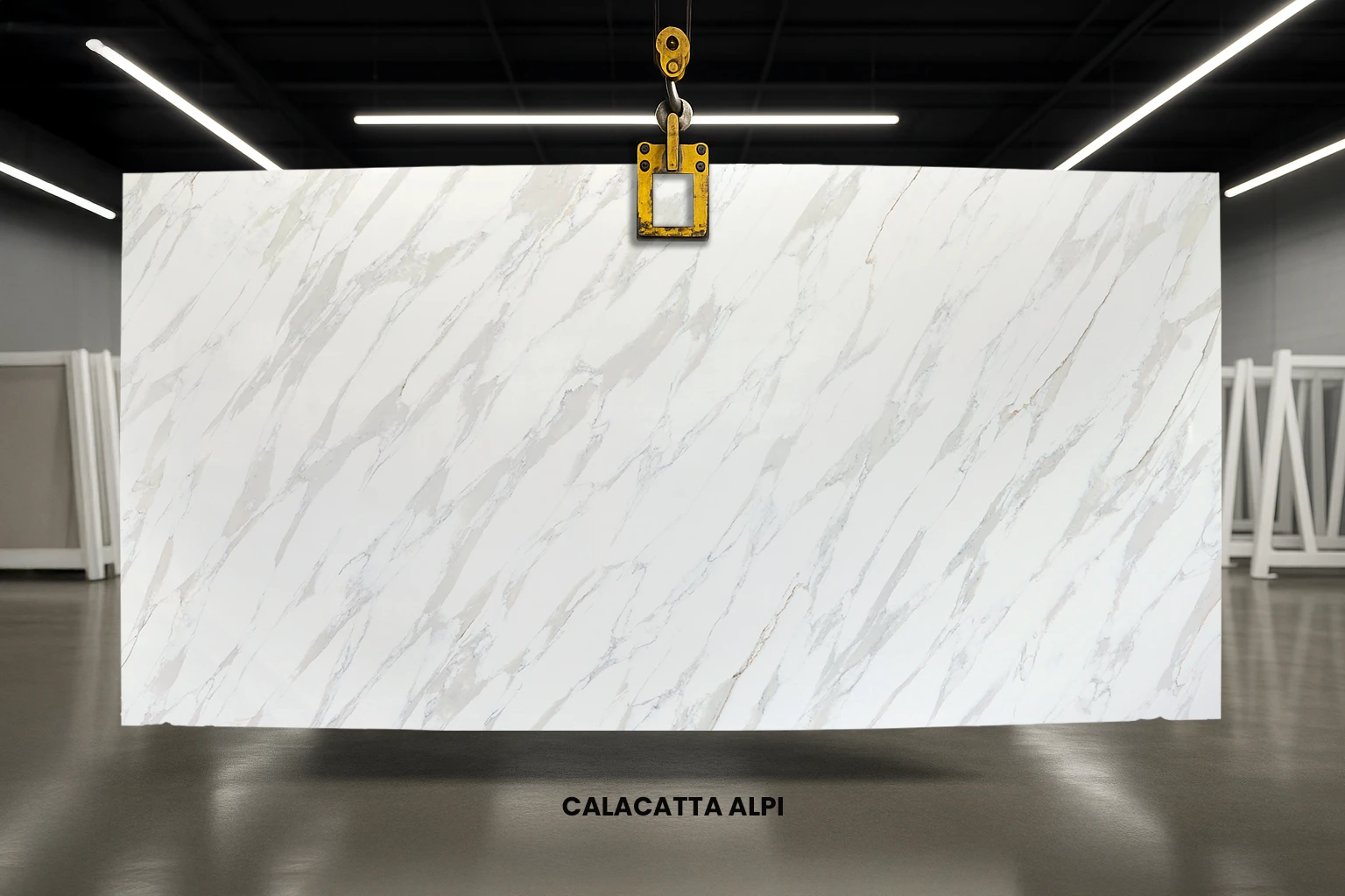 Calacatta Alpi quartz is inspired by the serene beauty of Calacatta Vagli Oro marble. It boasts a pristine white background adorned with bold grey and taupe veins. Its smooth surface and intricate movements evoke the natural beauty of marble, while its durability makes it perfect for high-traffic areas such as kitchen islands and bar tops. Elevate your space with the timeless elegance of Calacatta Alpi Quartz and create a sanctuary of sophistication in your home or commercial environment.