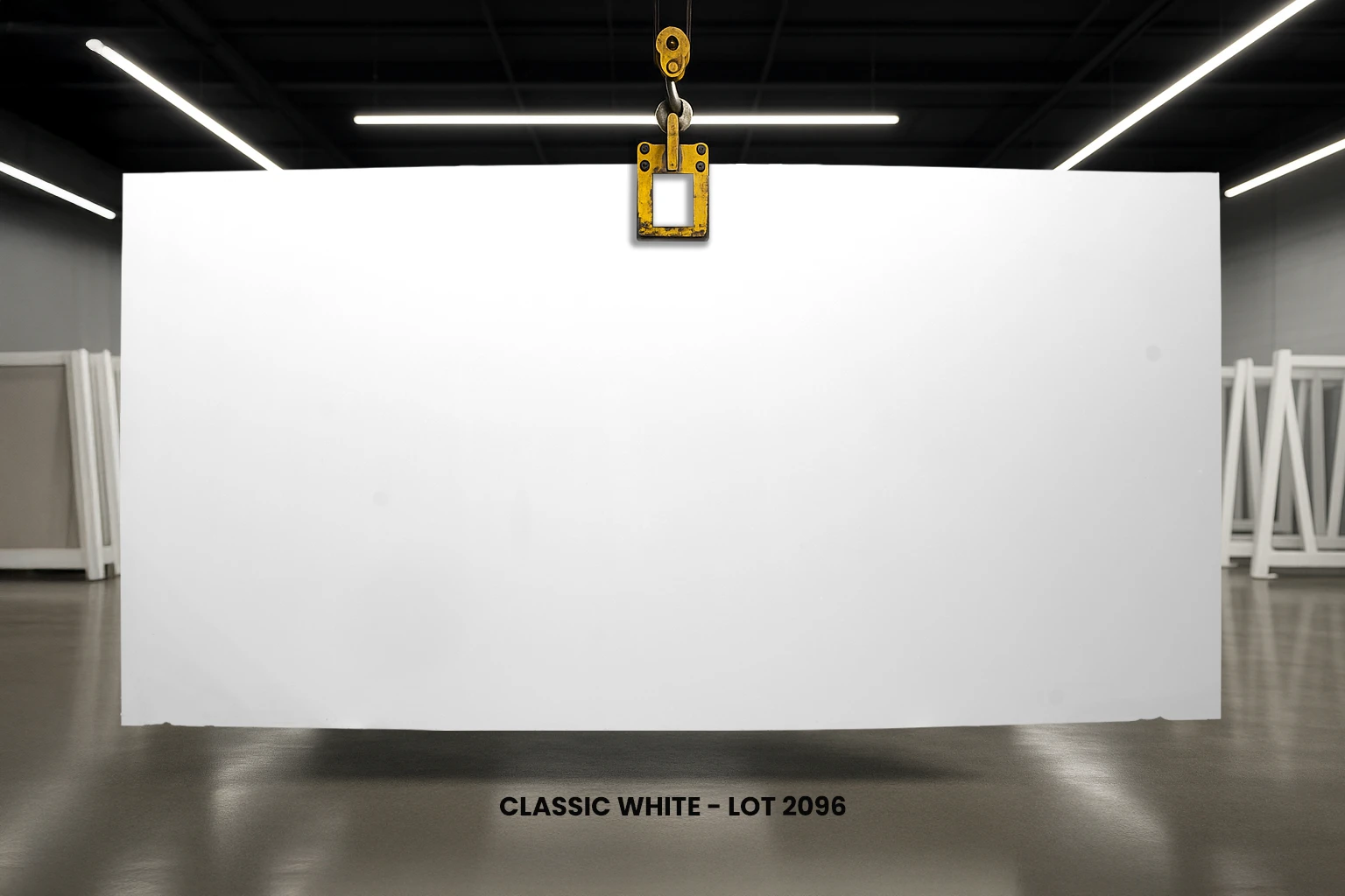 Classic White is a solid white quartz. Elegant and durable, this stone is suitable for creating crisp and sophisticated aesthetics. Its brilliant white background reflects light, brightening up any setting. Design luxurious residential and commercial spaces with the timeless charm of Classic White quartz.