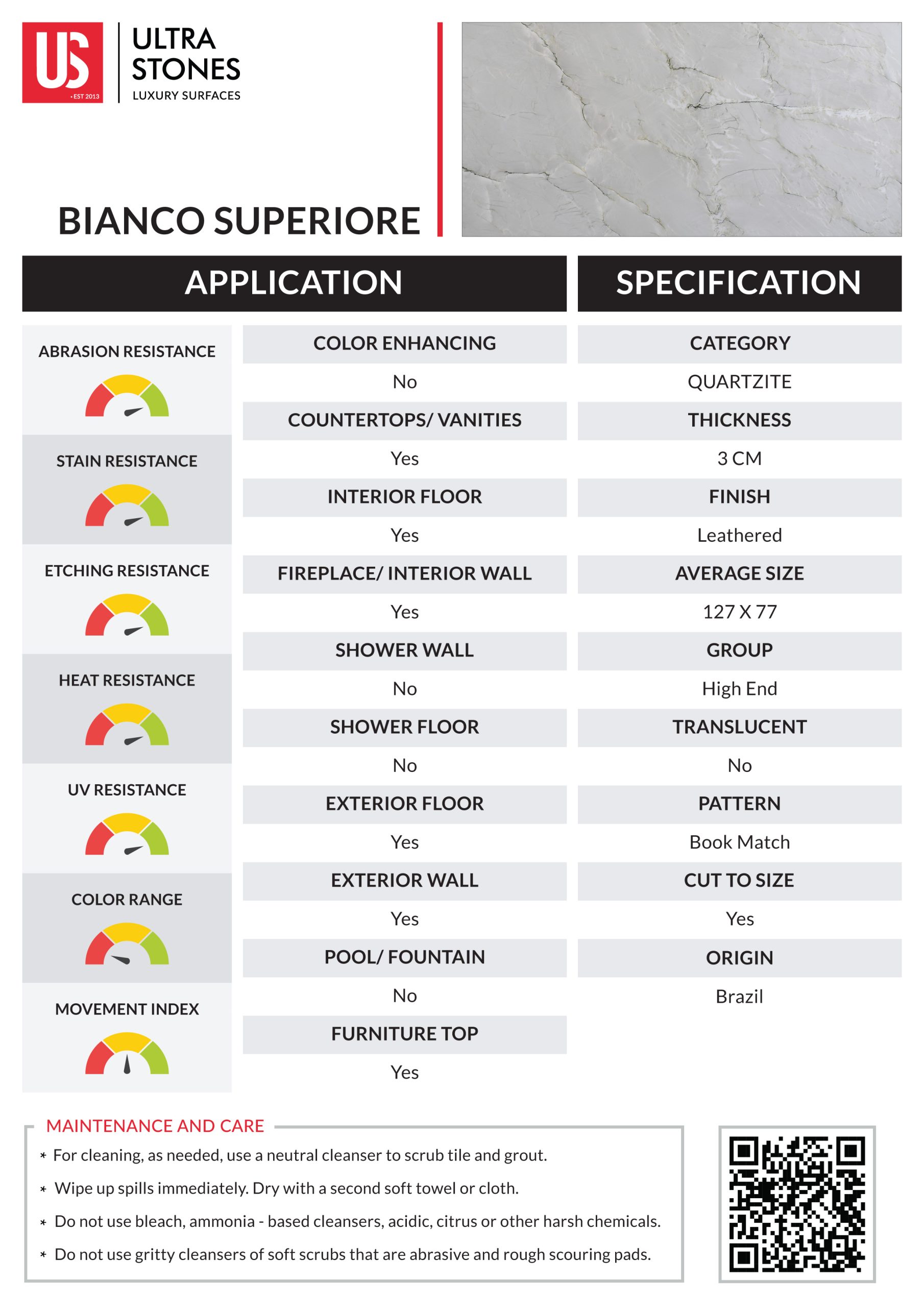 Bianco Superiore quartzite captivates with its untouched beauty and exceptional durability. It flaunts a light grey surface elevated by delicate white, sage green, and black veins, adding versatility and visual appeal to the stone’s appearance. Furthermore, its minimal yet elegant look pairs effortlessly with both traditional and modern design styles.