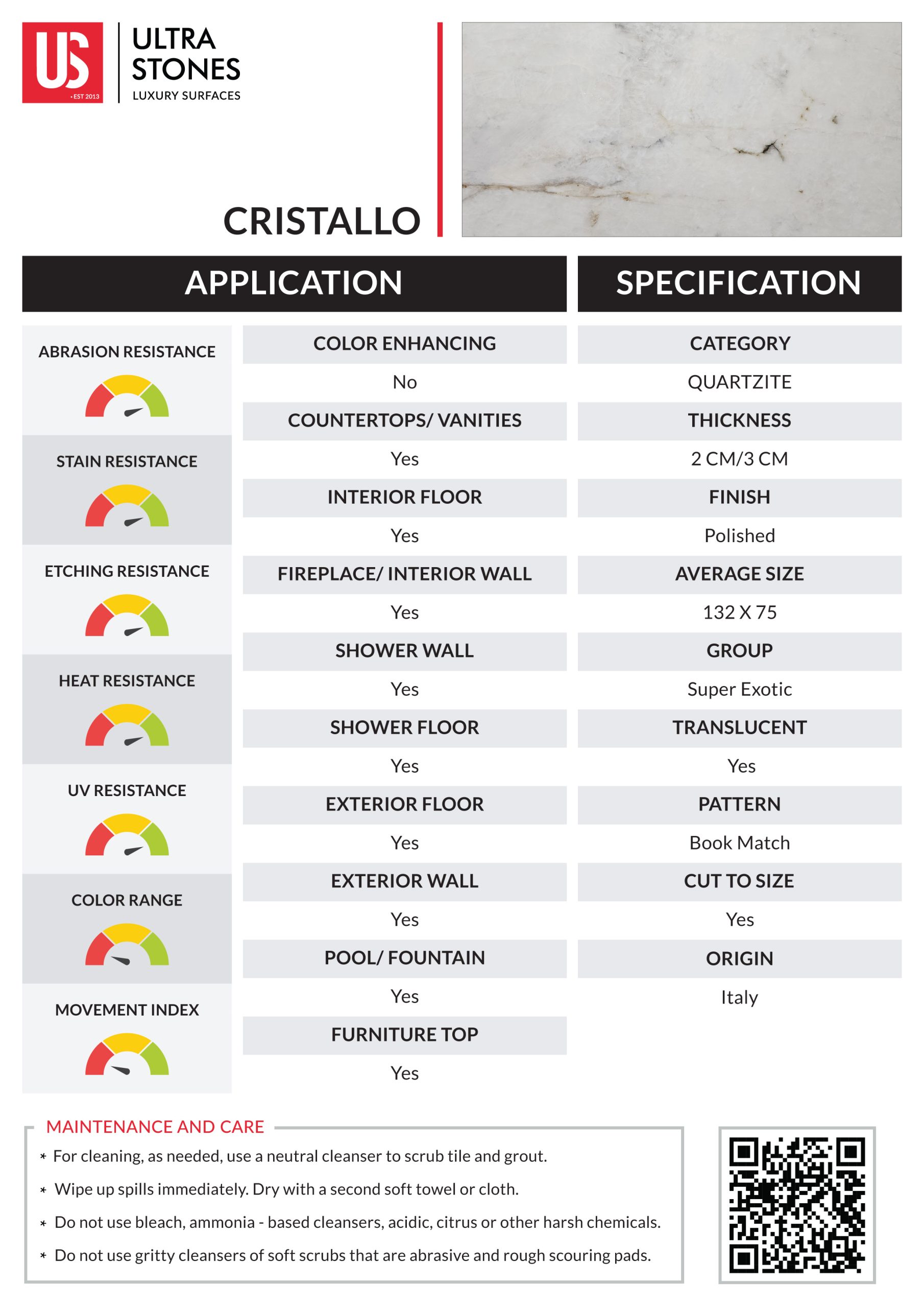 Cristallo is a refined translucent quartzite. Characterized by a soft white crystalline surface with occasional golden highlights, this stone exudes elegance and timeless appeal. Its neutral palette can blend effortlessly with various design aesthetics. Moreover, Cristallo emanates a soft glow when it is backlit, transforming any space into an enchanting abode. Create mesmerizing and durable spaces with our top-rated Cristallo. Create elegant countertops, accent walls, bar tops, and fireplaces with this magical piece of quartzite.