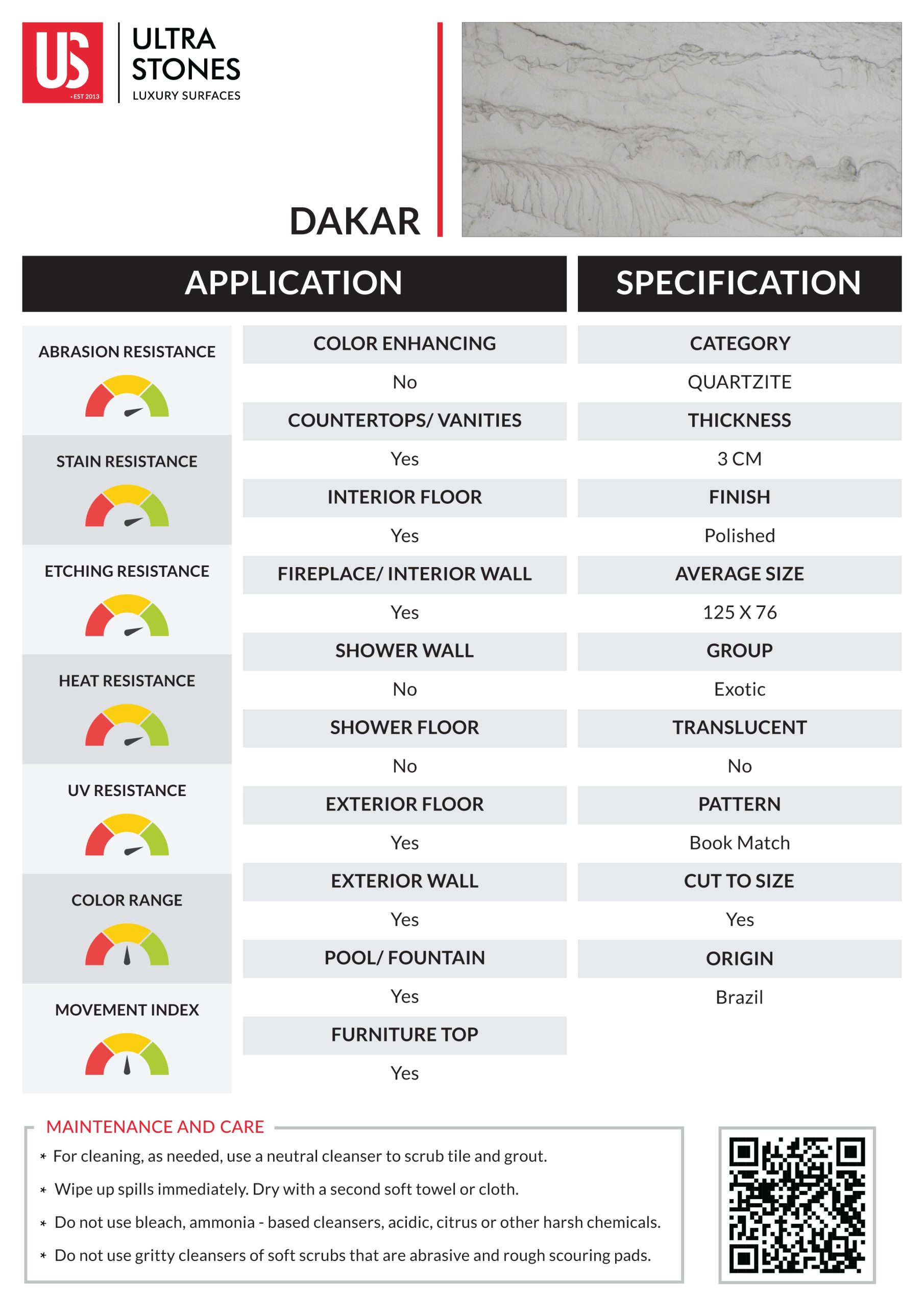 Dakar quartzite is a popular choice for designing residential and commercial spaces. It features a white background adorned with intricate grey veins forming stunning abstract patterns. Furthermore, its exceptional resistance to heat, staining, and scratching makes Dakar quartzite suitable for high-traffic areas.