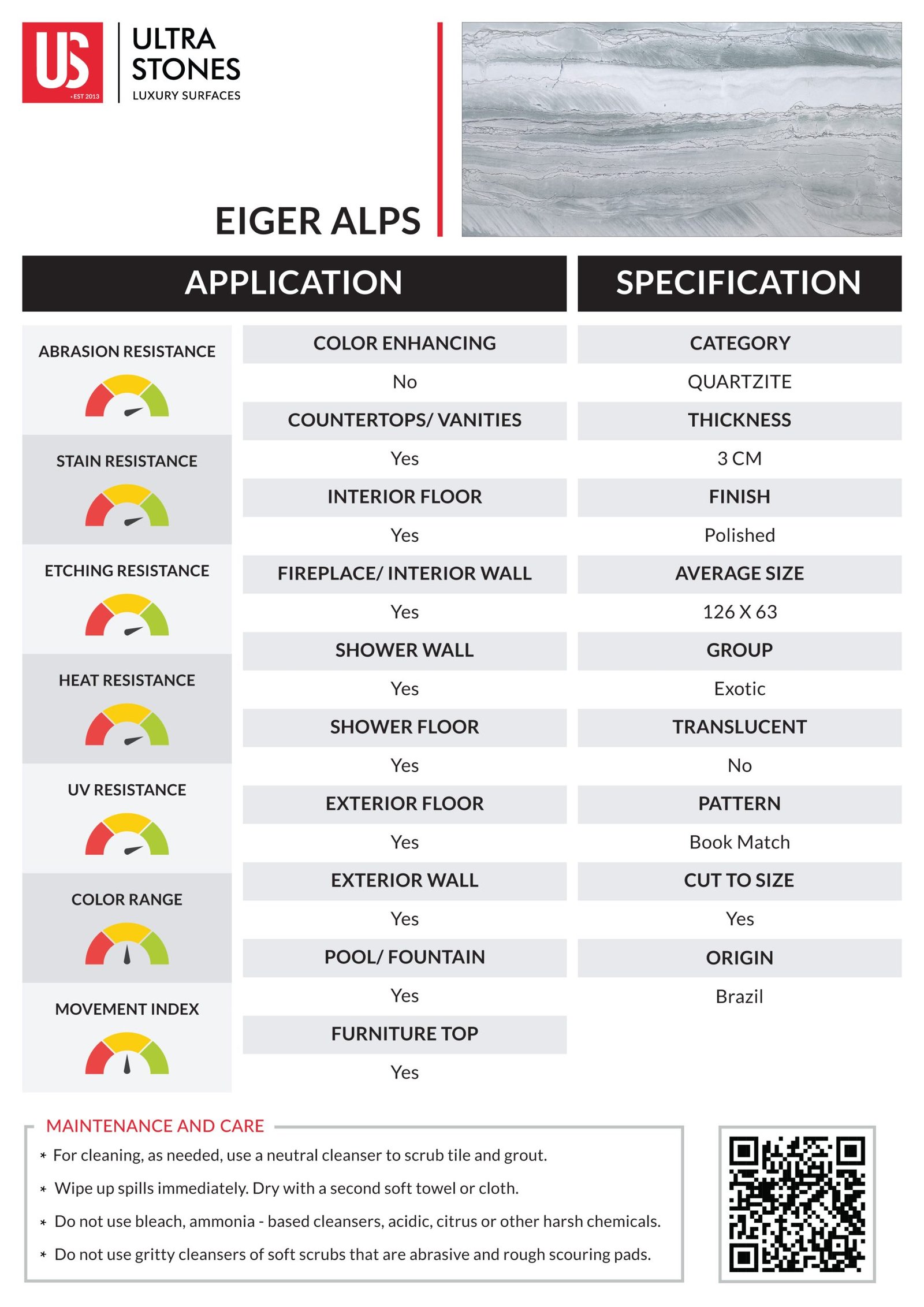 Eiger Alps quartzite is prized for its unique aesthetic. With a white surface highlighted by bluish-grey overtones and thin grey veins, the stone appears visually dynamic, making it a perfect choice for creating stunning focal points. Its blue-grey palette resembles snowy mountain landscapes. As beautiful as it is, Eiger Alps quartzite is equally durable, enhancing the longevity of spaces.