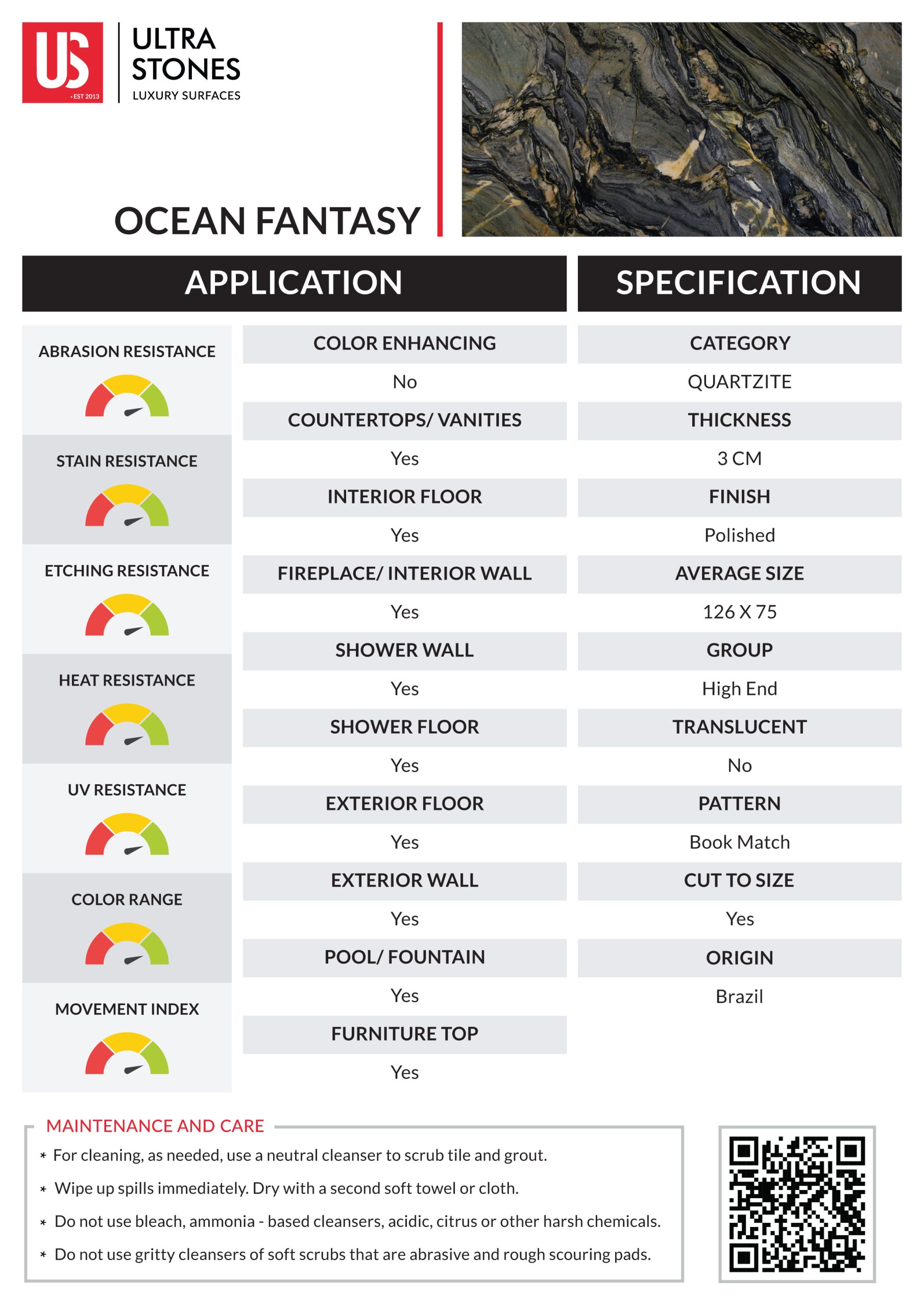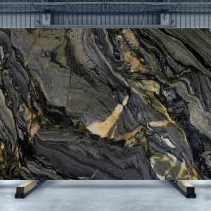 Ocean Fantasy is a captivating quartzite, characterized by intricate patterns, this stone exudes a dramatic charm that can elevate any design scheme. Green, beige, and grey veins weave into an ecstatic abstract pattern that resembles sea weeds deep under an ocean. Incorporate this stone into your design projects to create visually intriguing interiors.