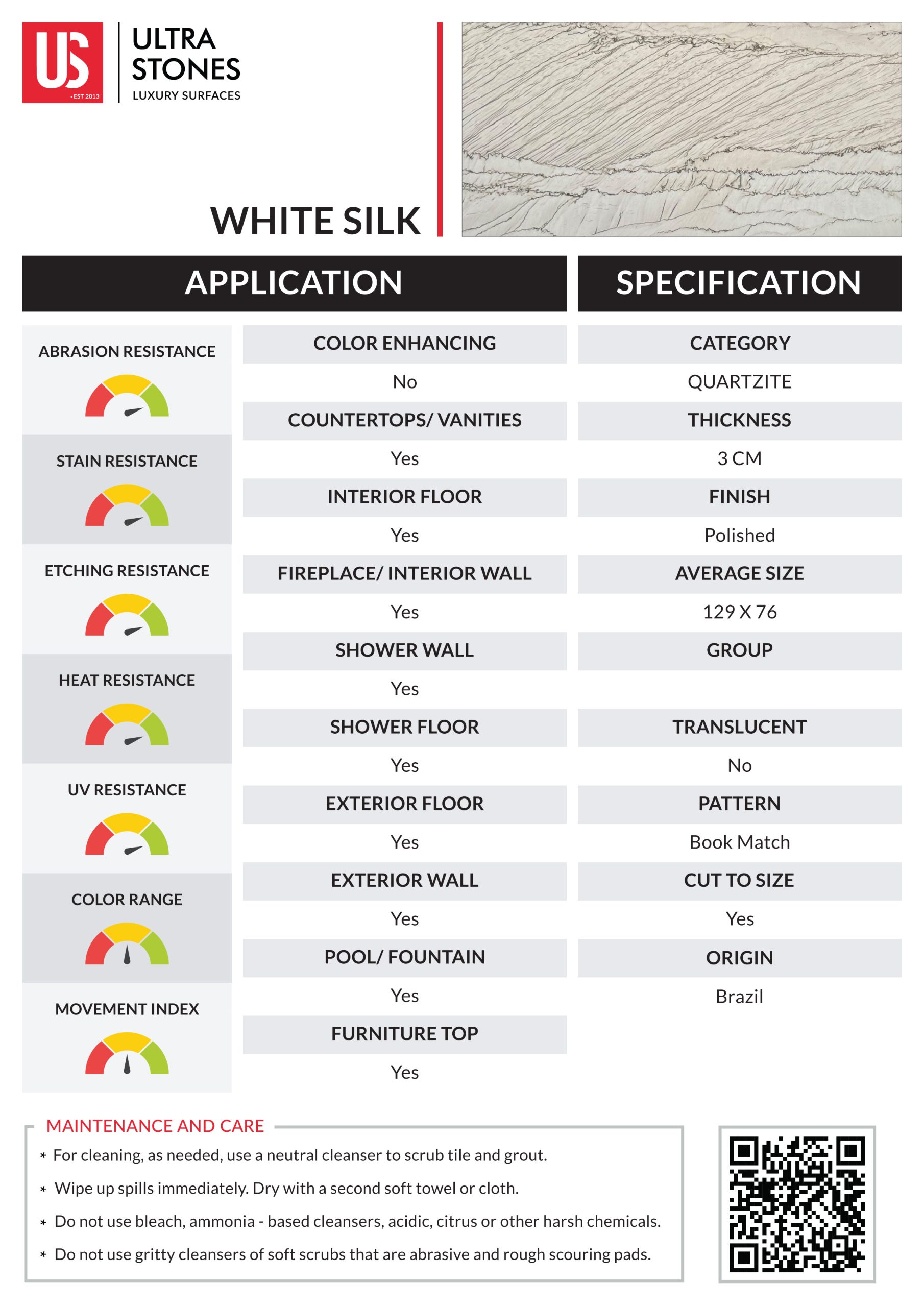 White Silk is a beautiful, soft-toned quartzite. It features a pleasing warm-white to beige surface inked with thin black veins standing out in a captivating contrast. Its somber shades along the veins resemble the soft folds of silk fabric. Elegant and durable, White Silk quartzite can aesthetically and functionally elevate any space.