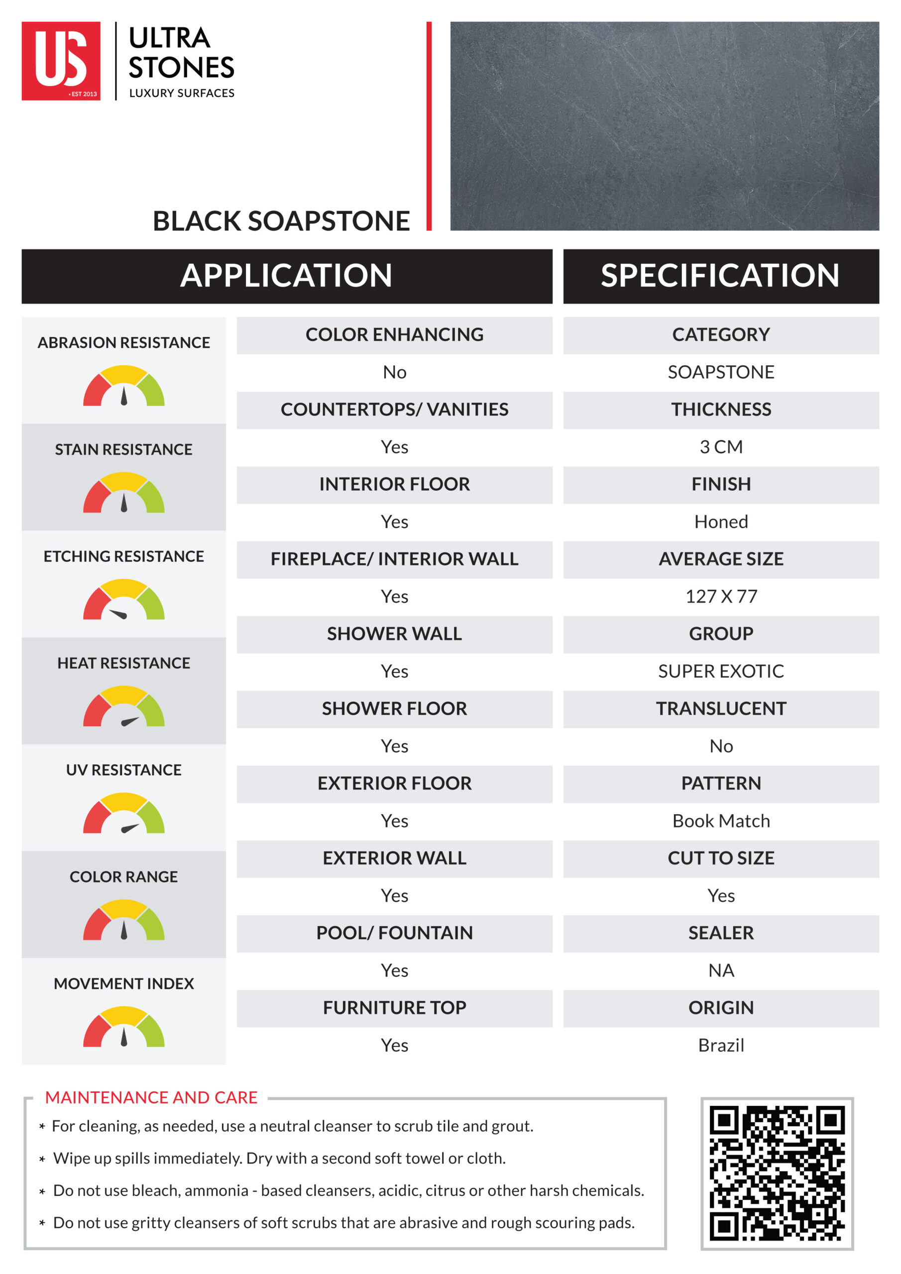 Black Soapstone is the epitome of earthy elegance and sophistication. Quarried in Brazil, equipped with impeccable strength and resilience, this natural stone is suitable for both indoor and outdoor applications where durability is desired. Its deep grey canvas is highlighted by subtle white streaks, creating a tasteful contrast. Black Soapstone in honed finish combines timeless aesthetics and functionality, making it a perfect surface for designing both residential and commercial spaces.