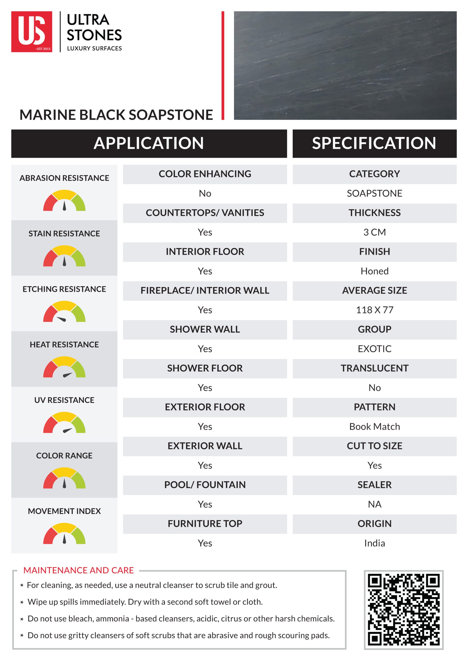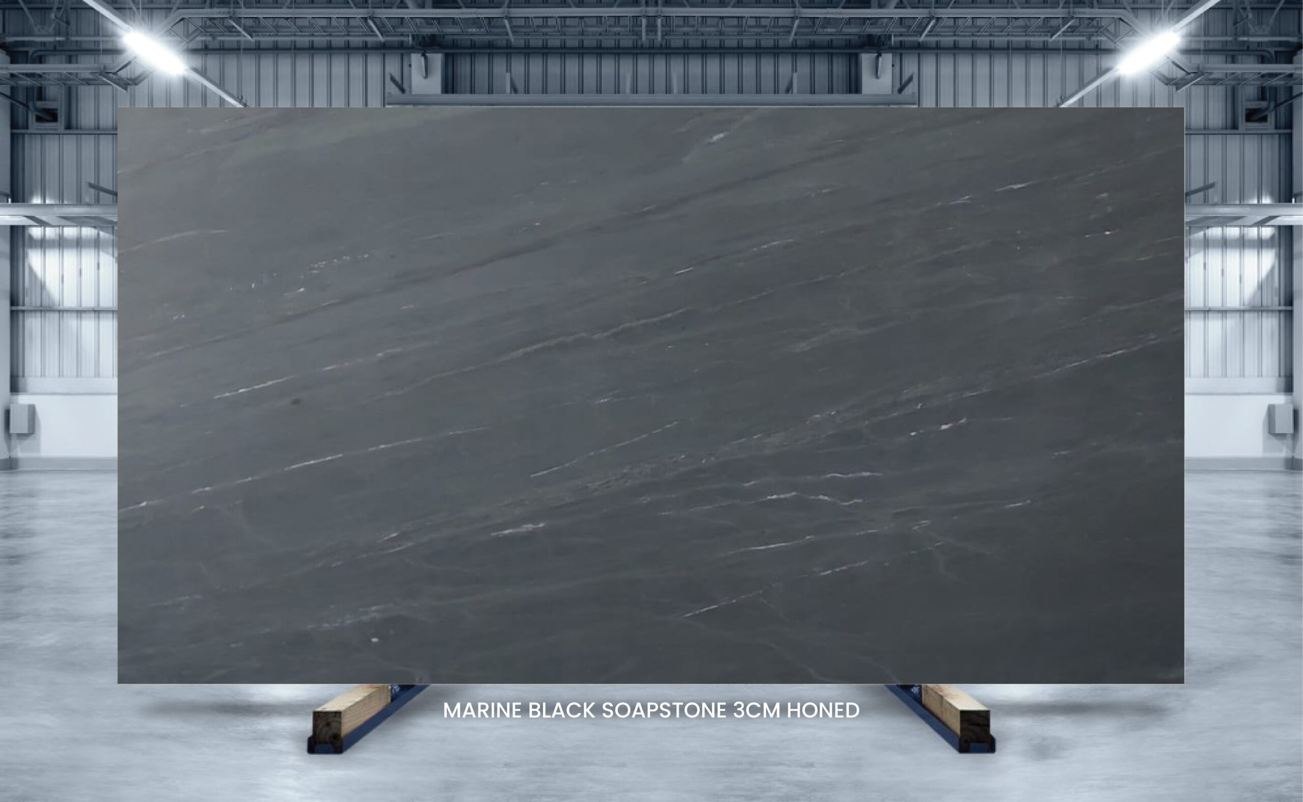 Marine Black Soapstone is known for its minimal appearance. Hailed from India, It boasts a deep grey to black surface adorned with subtle white veining patterns. Its sleek and uniform aesthetic works perfectly in stylish contemporary settings, and its exceptional durability makes it a functional surface for high-traffic areas of the space. Give your kitchen and bathroom a refreshing upgrade with the charming earthy tones of this natural surface.