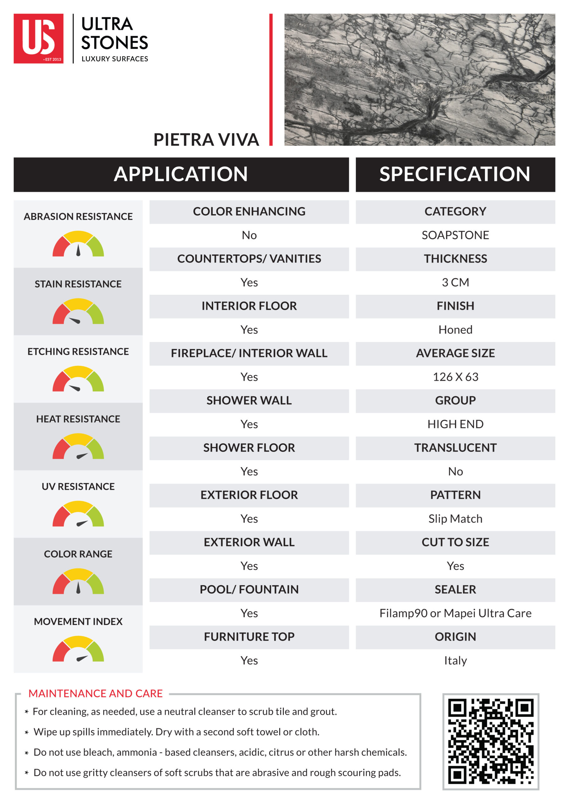 Pietra Viva is a stunning Italian soapstone characterized by a clean white background and bold grey to black veining. This dramatic stone is perfect for statement accent walls, kitchen countertops, vanity tops, shower walls, and other contemporary design features. Suitable for both interior and exterior use, Pietra Viva offers enduring beauty with a modern edge.
