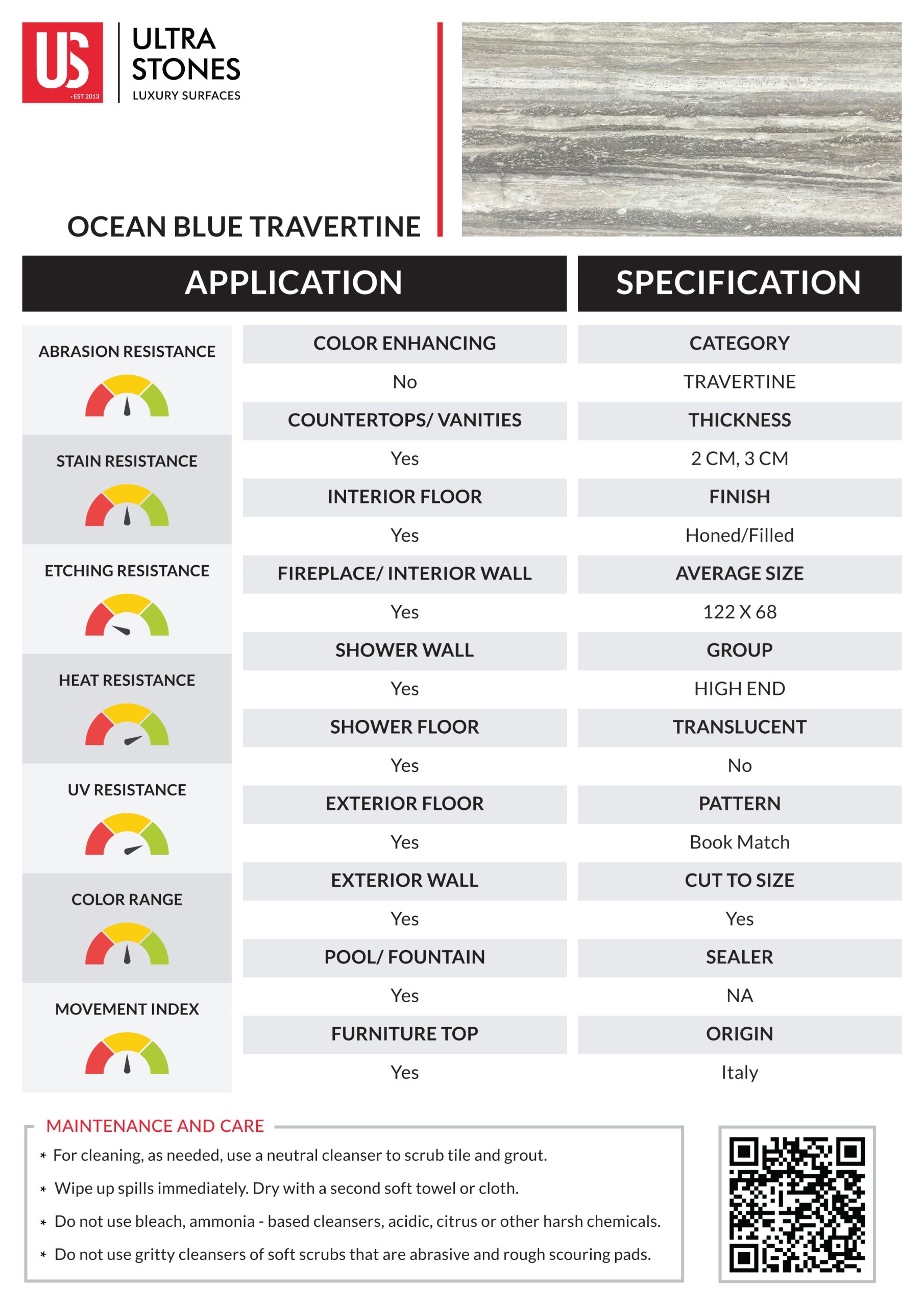 Sourced from Italy, Ocean Blue Travertine is known for its muted palette and understated elegance. This stone features soft, linear striations in bluish-grey, white, and beige hues. This natural stone is a perfect choice for creating cohesive and inviting spaces. Its exceptional resistance to external impacts contributes to a space’s overall durability.