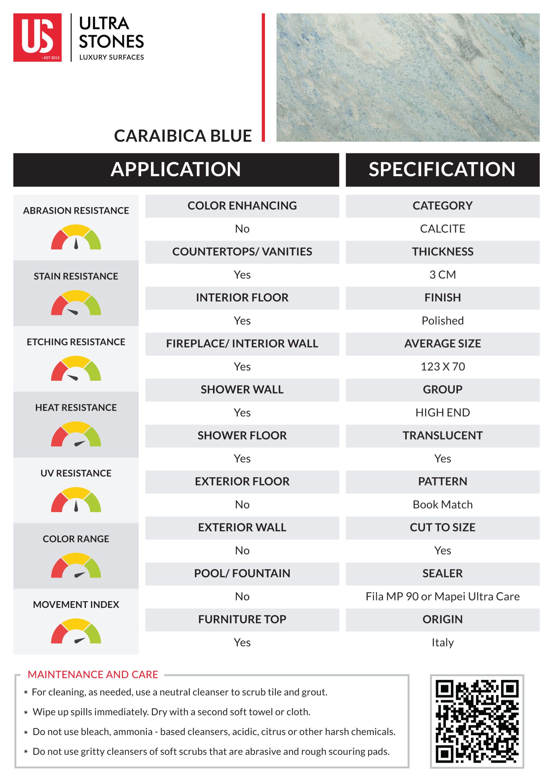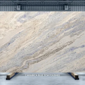 A Caraibica Blue Calcite stone slab is a magnificent natural work of art that originates from the enchanting region of the Dominican Republic in the Caribbean. This stunning slab is a testament to the geological wonders of the Caribbean, known for its crystalline waters and breathtaking landscapes. The mineral composition of Caraibica Blue Calcite primarily consists of calcium carbonate, a common element in calcite stones. However, what sets it apart is the infusion of trace minerals, such as copper and manganese, which imbue it with its mesmerizing shades of blue, reminiscent of the Caribbean Sea itself. The swirling patterns and gradients within the slab create a sense of depth and movement, making each piece utterly unique. This rare and exquisite natural creation not only serves as a striking centerpiece in architectural and interior design but also holds the metaphysical qualities associated with calcite, believed to promote serenity, clarity, and effective communication. Whether used as a countertop, wall panel, or decorative element, a Caraibica Blue Calcite stone slab is a true treasure from the heart of the Caribbean, bringing the beauty of the region’s landscapes into your living space.