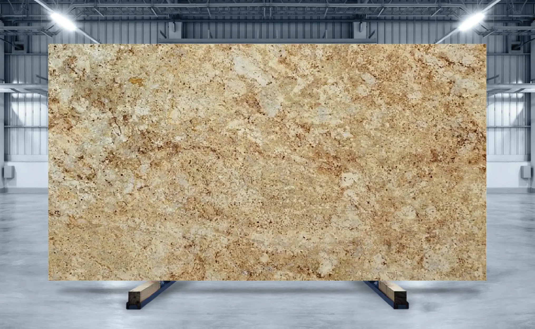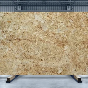 Colonial Gold granite is one of the popular surfaces for designing elegant and durable interiors. This high-end granite features a beige background with dark and light overtones. Brown mineral inclusions across the slab add depth to the stone’s appearance. Design aesthetic countertops, flooring, and wall cladding with this premium granite.