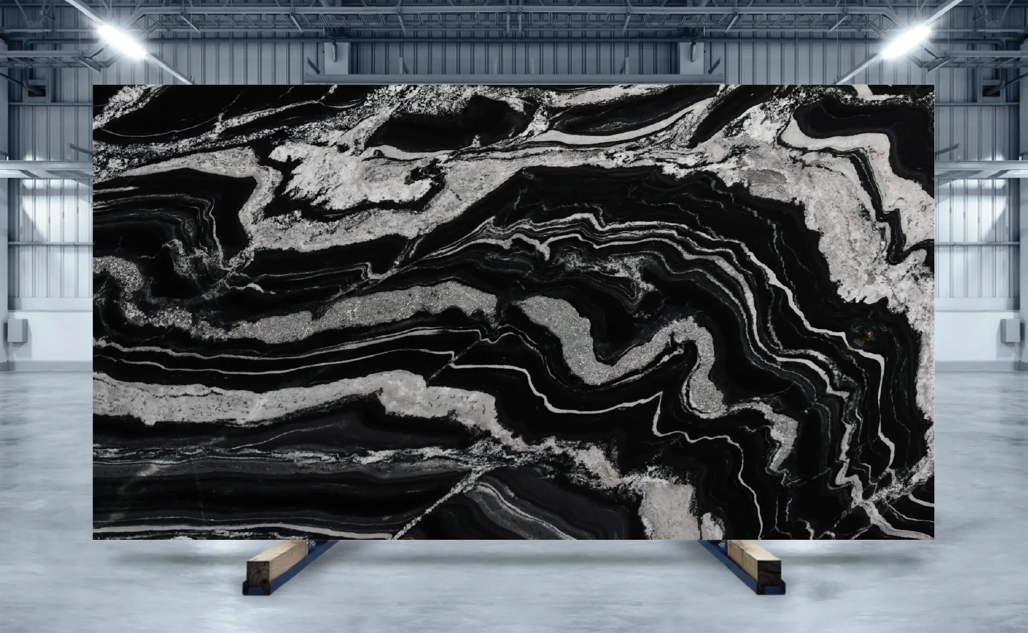 Eclipse granite is prized for its dramatic appeal. Quarried in Brazil, this granite showcases majestic white and silver bands flowing across a deep black surface. Its bold appearance makes Eclipse a perfect choice for designing visually arresting accent walls, islands, fireplaces, shower walls, and other decorative features.