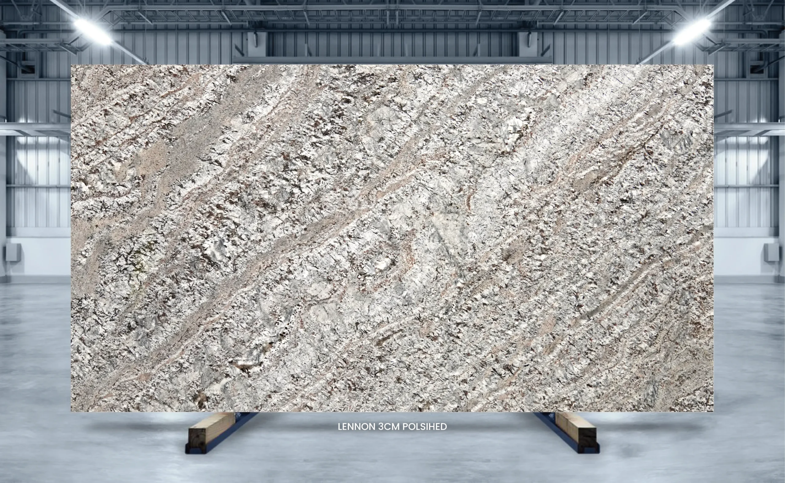 Lennon is an exotic granite quarried in Brazil. It features intricate patterns in grey, brown, and silver hues. Bold and durable, this granite is ideal for accent features such as countertops, feature walls, fireplace surrounds, and more.
