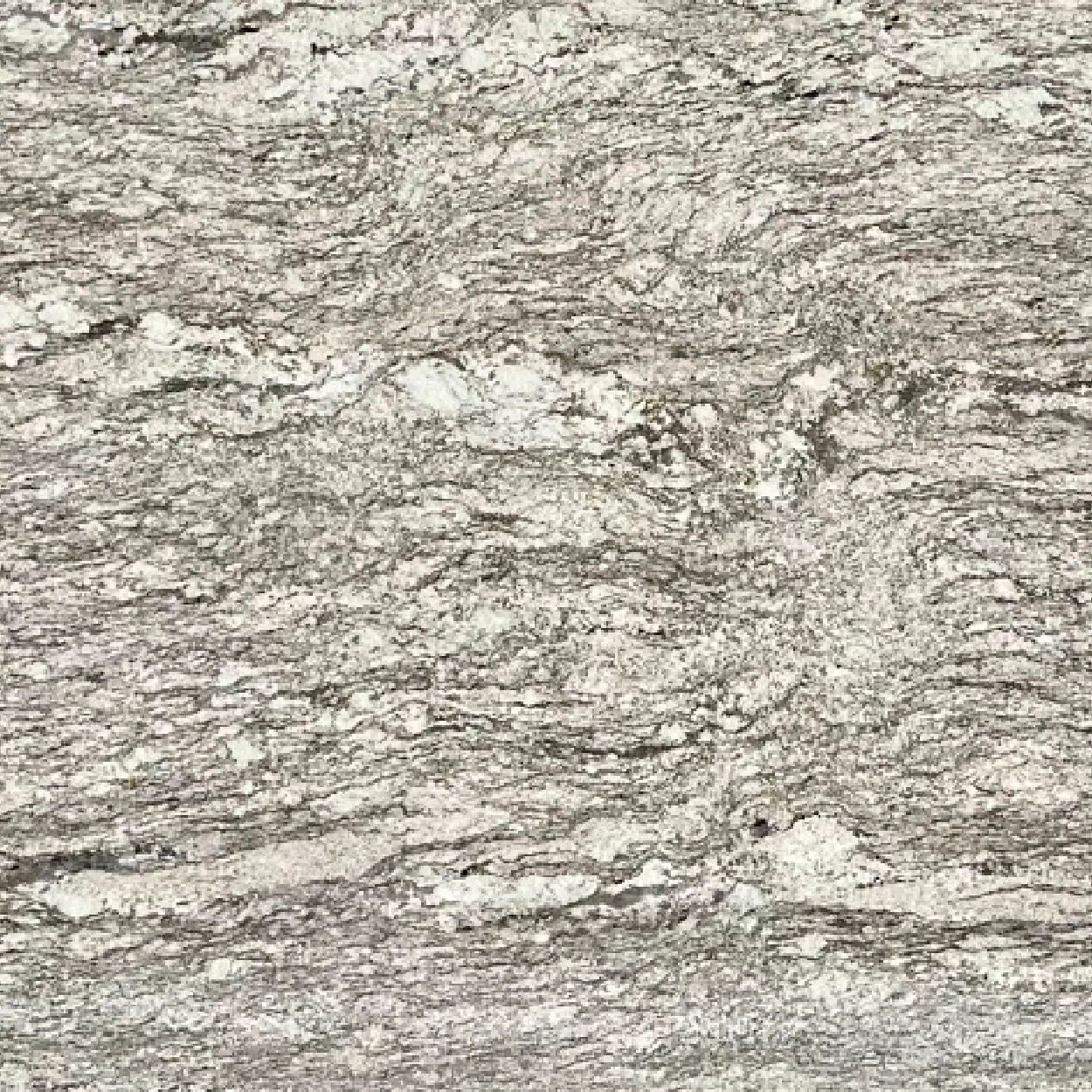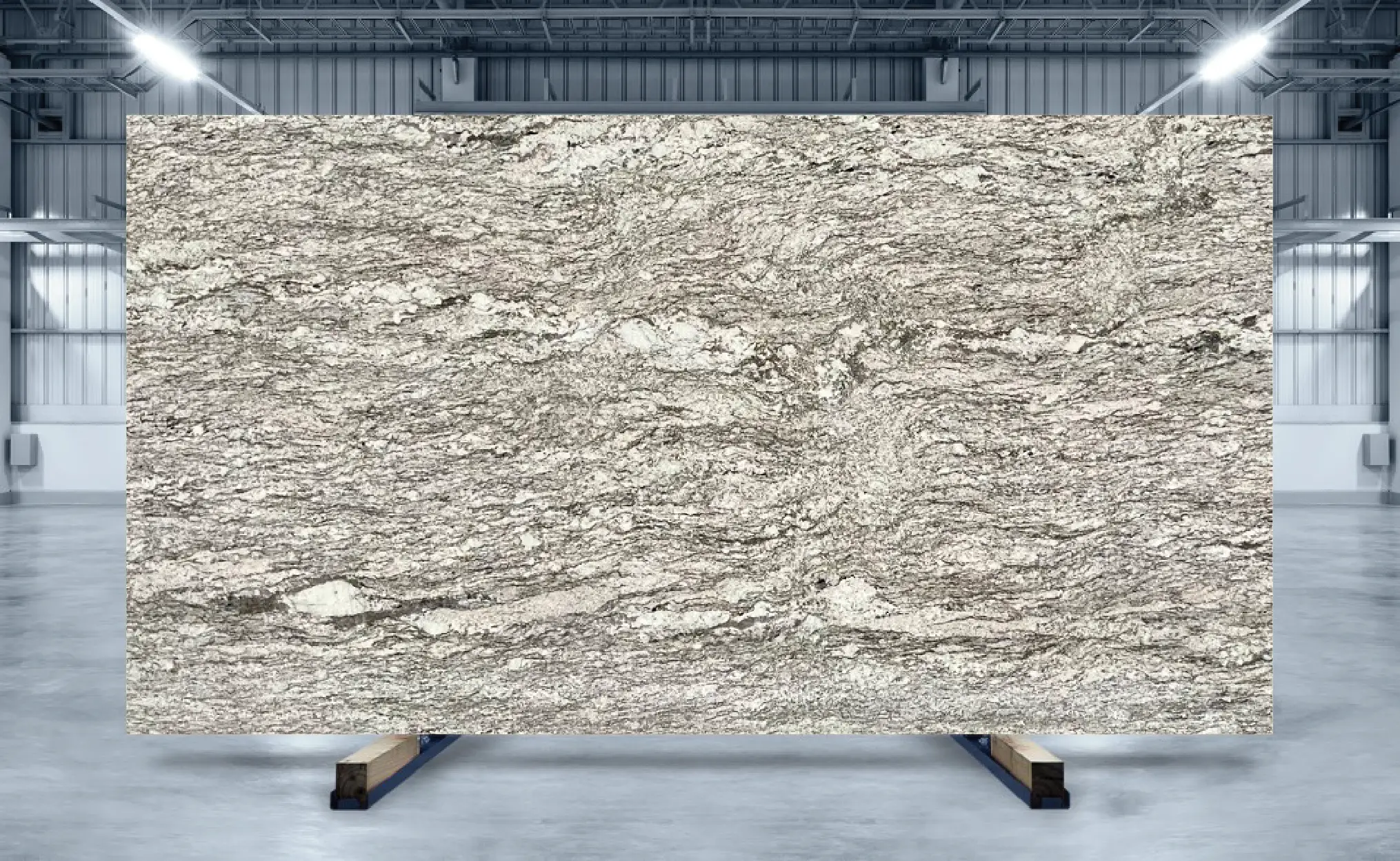 White Alamo granite exudes timeless elegance and versatility. It flaunts a soft off-white surface interlaced with grey veins, adding visual interest and texture to the stone’s appearance. Whether used for an accent wall or tabletop, White Alamo granite can add a dramatic layer to your interior designs.