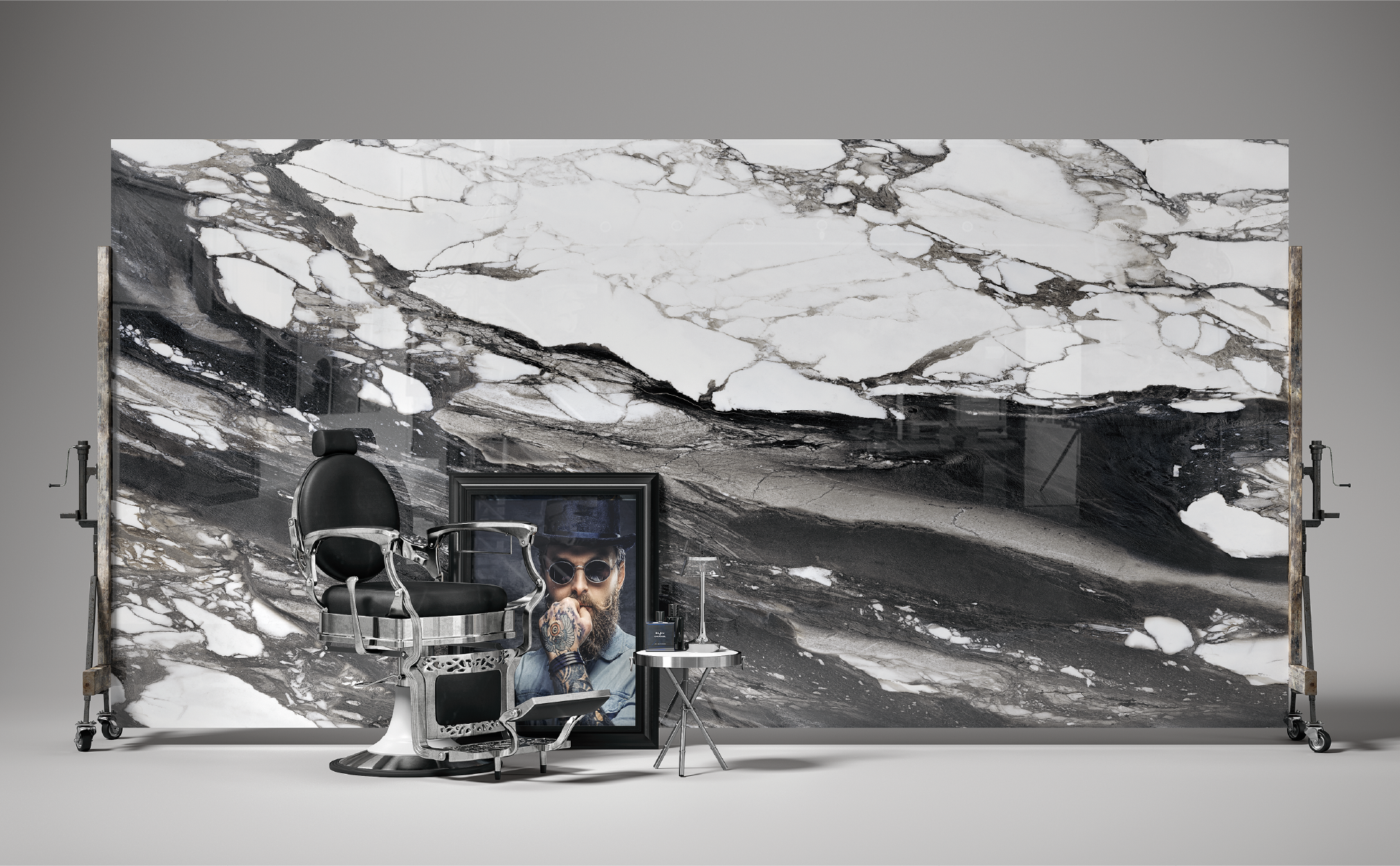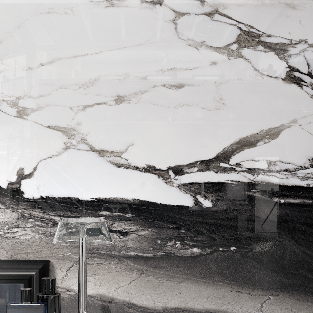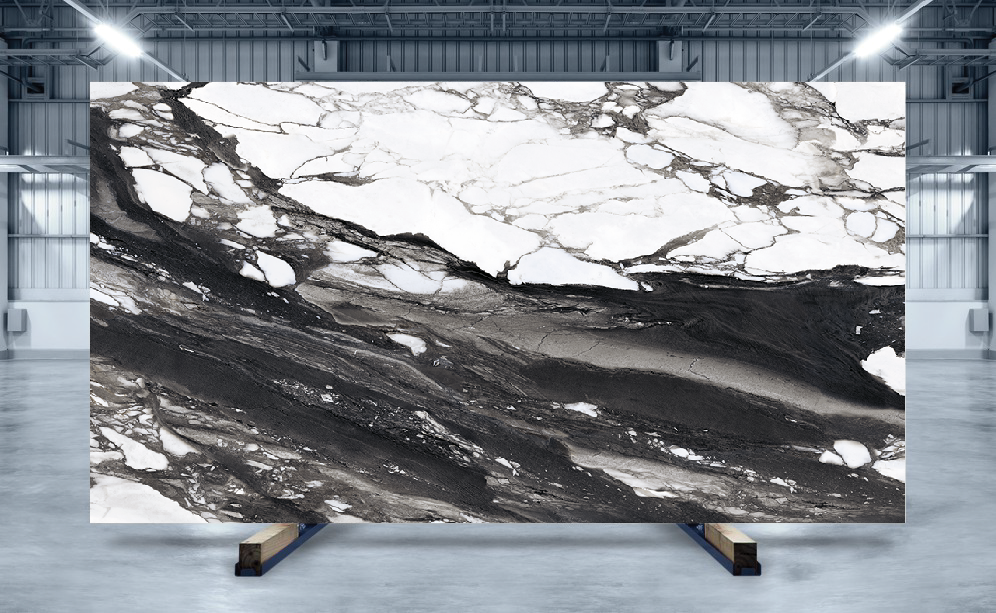 One of the finest large format kaolin slabs, the clean and crisp white backdrop with black pattern appears as if ink is splashed on white canvas. It can enhance the aesthetic appeal of your personal space, an ideal choice for construction of kitchen island waterfalls, kitchen countertops, backsplash, wall cladding, flooring, vanity tops, bar cabinets and much more.