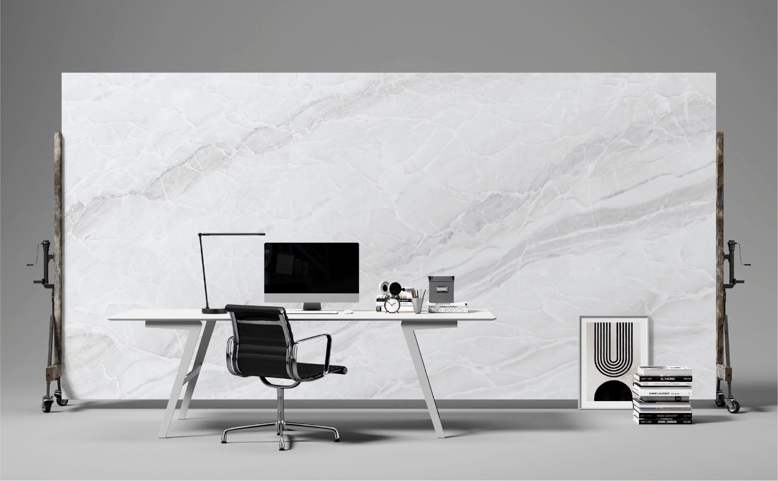 A stunning man-made kaolin slab with brilliant white backdrop and occasional greys and soft texture with breathtaking design which gives it a resemblance to natural stone. The contemporary style of this man-made stone is also an ideal choice for modern design as well. It can be used for construction of kitchen countertops, vanity tops, bar cabinet, accent walls, backsplash, bathrooms, flooring, wall cladding and much more.
