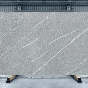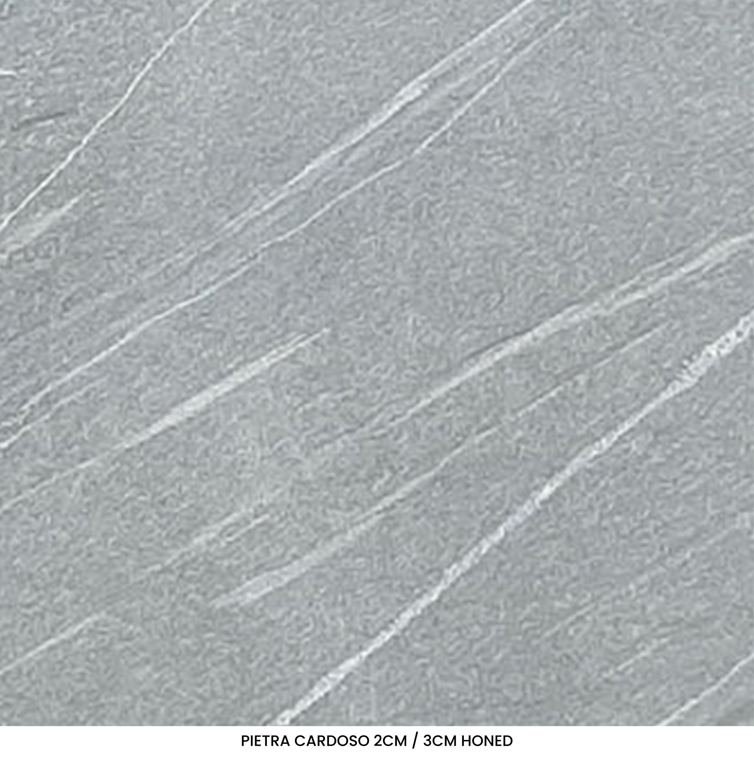 Pietra Cardoso is coveted for its earthy palette and durability. It features a light slate gray surface highlighted by occasional white calcite veins, adding visual depth to the stone’s appearance. The cool palette of Pietra Cardoso blends into various design styles, bringing serene and rustic vibes to any setting.