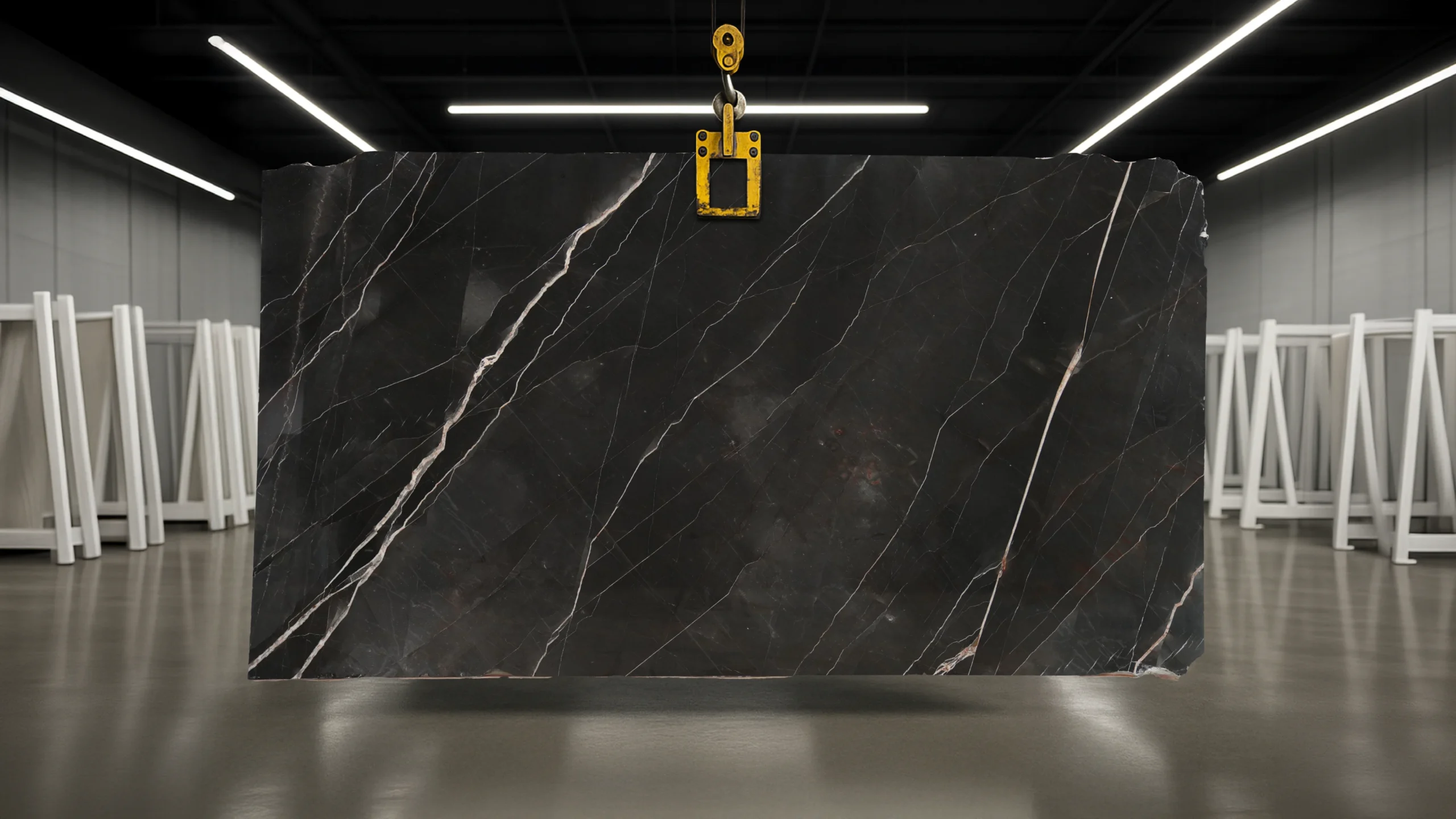 Behold the magnetic charm of our Calacatta Black marble renowned for its dramatic white veining and luxurious appeal. The marble comes in a rich black background embellished with bold, contrasting veins of white, brown, and golden veining patterns. Each slab of Calacatta black marble looks unique, exhibiting its own intricate variations and patterns, which makes it an attractive choice for creating dark, glamorous interiors. When Calacatta Black is used as countertops, flooring, or accent pieces, it can offer an interesting look to any setting. Calacatta Bluette.