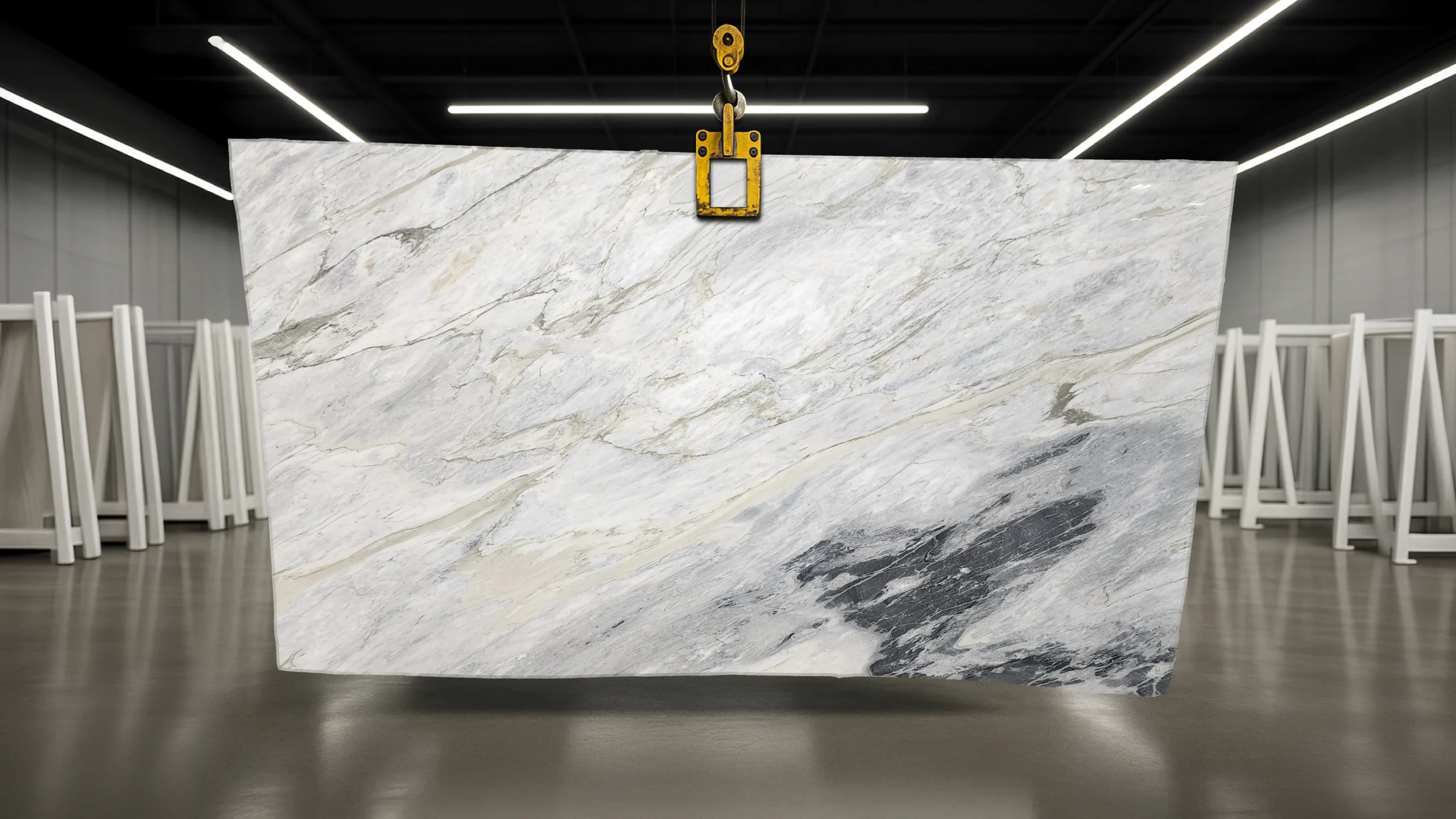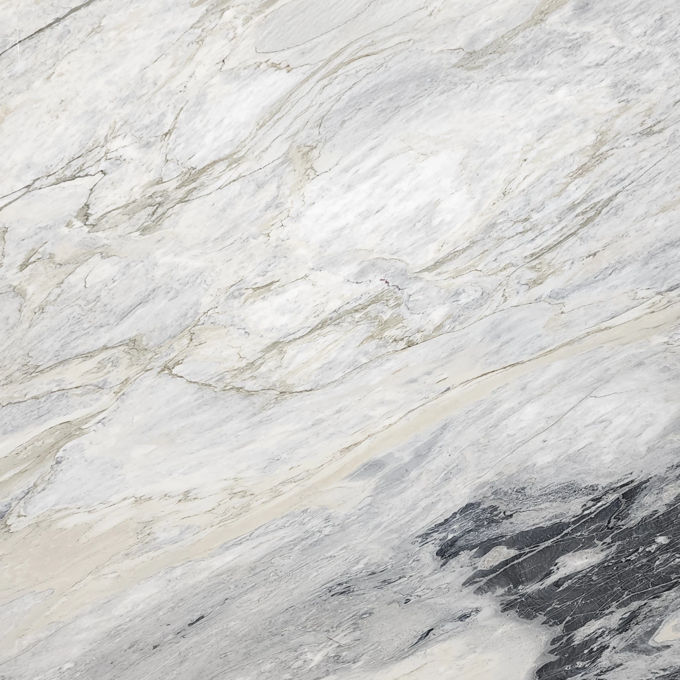 Calacatta Manhattan marble is a soft drama in stone. Quarried in Italy, its white surface is kissed with fluid patterns in cream, ivory, olive, grey, and charcoal tones. These warm and cool tones marble into each other, offering subtle depth and layers. When used as countertops or flooring, Calacatta Manhattan gives spaces a cozy and inviting makeover.