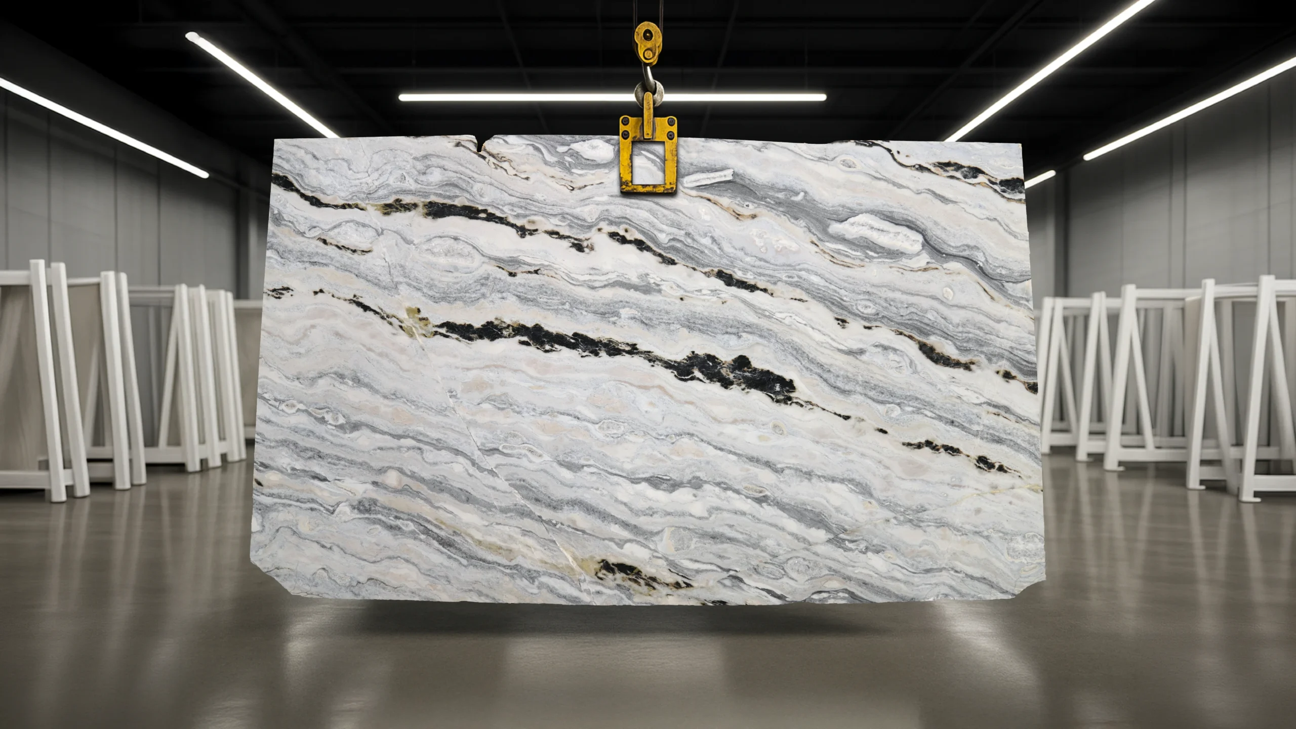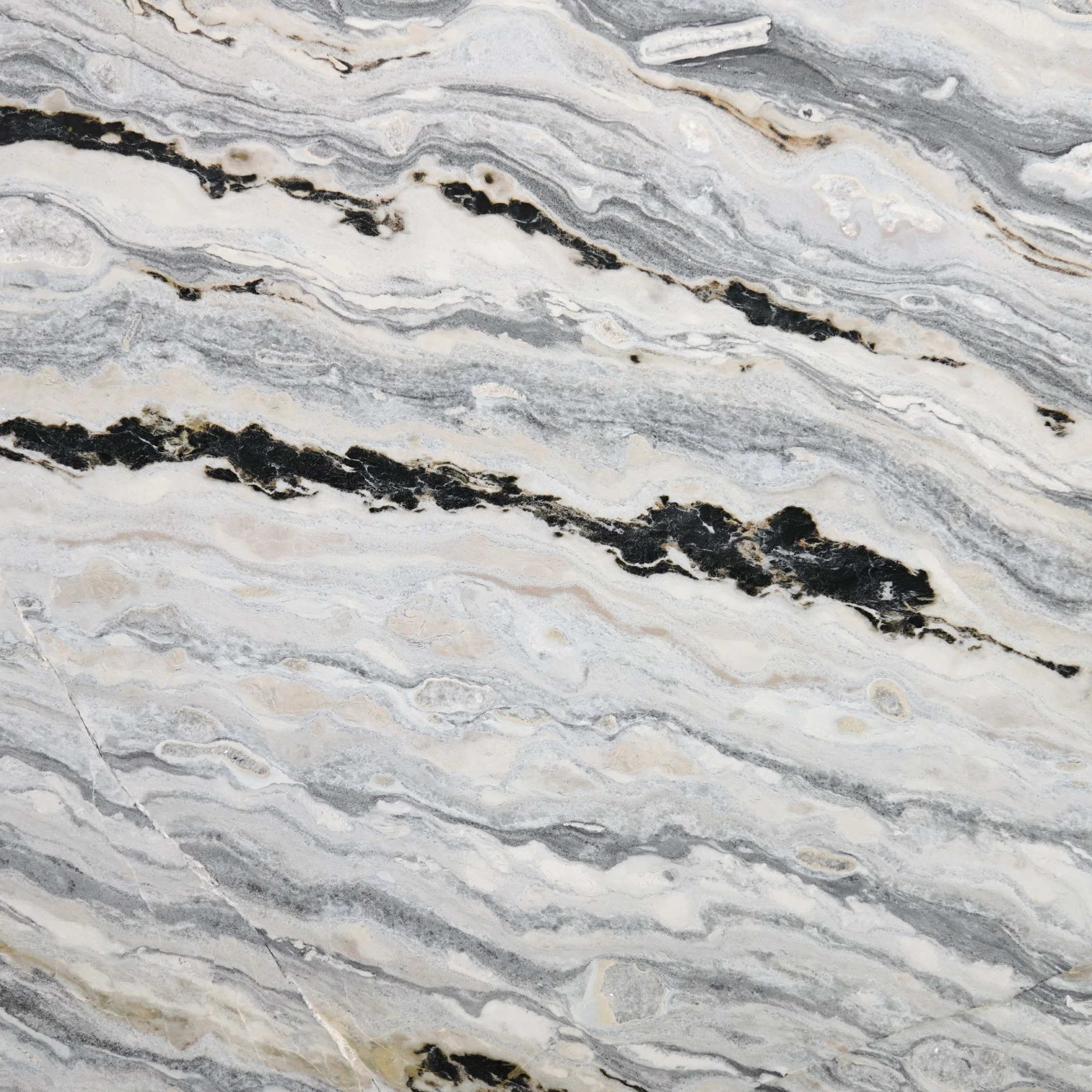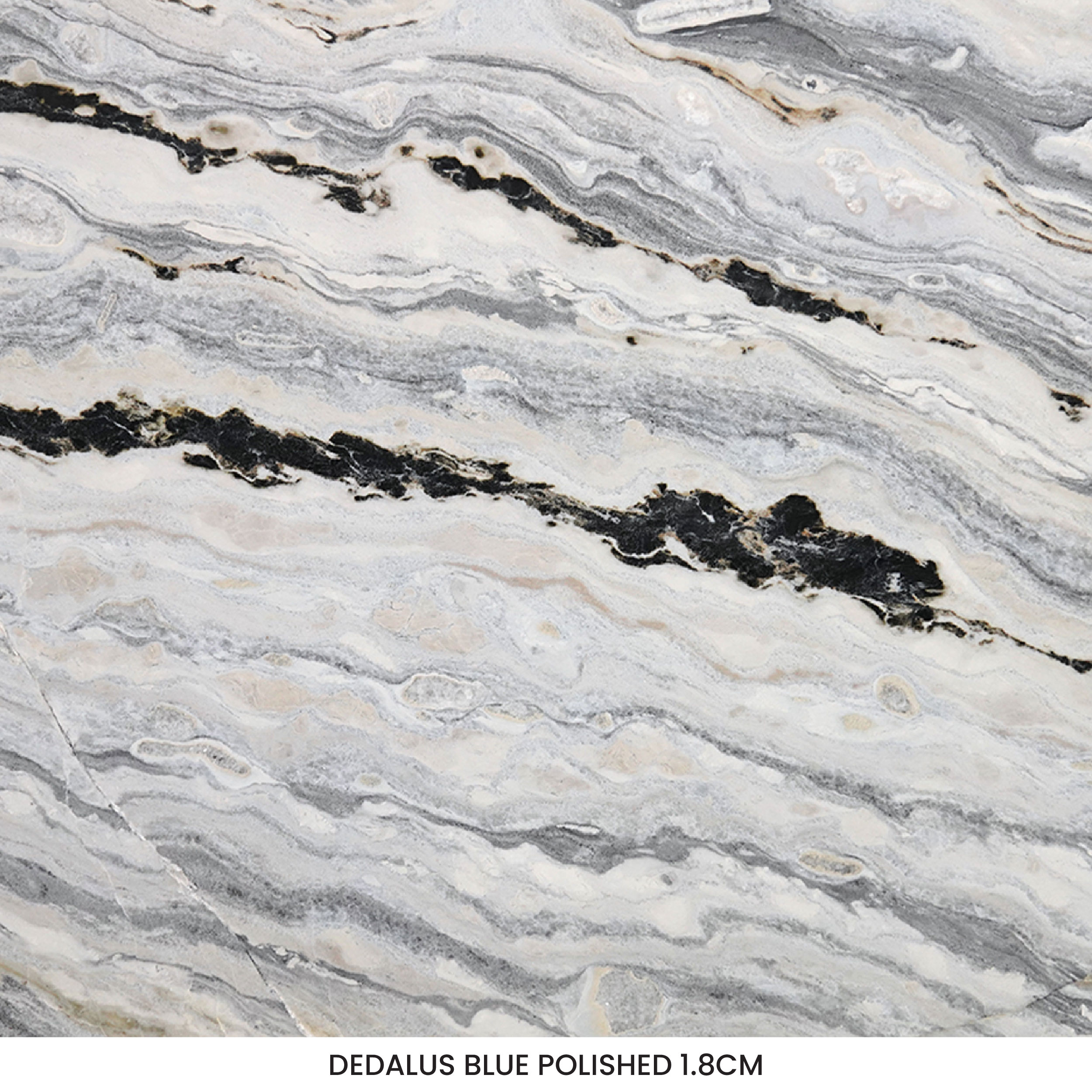 Dedalus Blue marble features striking contrasts of bluish-grey, black, and creamy white veins flowing across the slab. The stone evokes a sense of movement and depth through a perfect interplay of timeless, classic palettes. It is an excellent addition to contemporary fireplace surrounds, kitchen countertops, and accent walls. Bring a vibrant look to your spaces with this exotic piece of marble.