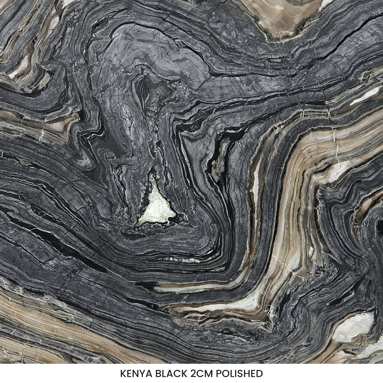 Kenya Black marble features dramatic veining in black, beige, and grey tones. Its striking patterns and rich contrast add visual intrigue to accent walls, countertops, and other decorative features. Dramatic and durable, this Italian marble elevates the aesthetic and functionality of both residential and commercial interiors.