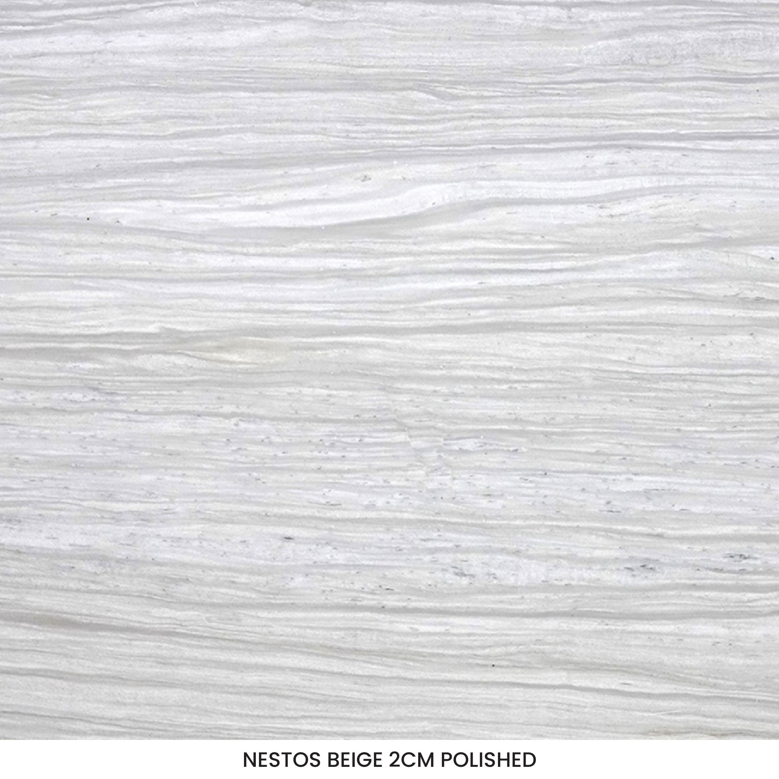Nestos Beige marble features linear grey and beige veins strewn across its surface, offering a serene appeal to both residential and commercial spaces. Quarried in Greece, this classic marble exudes a cool, sophisticated aesthetic. Its versatility makes it suitable for both indoor and outdoor applications, brightening up spaces with its refined hues and timeless charm.