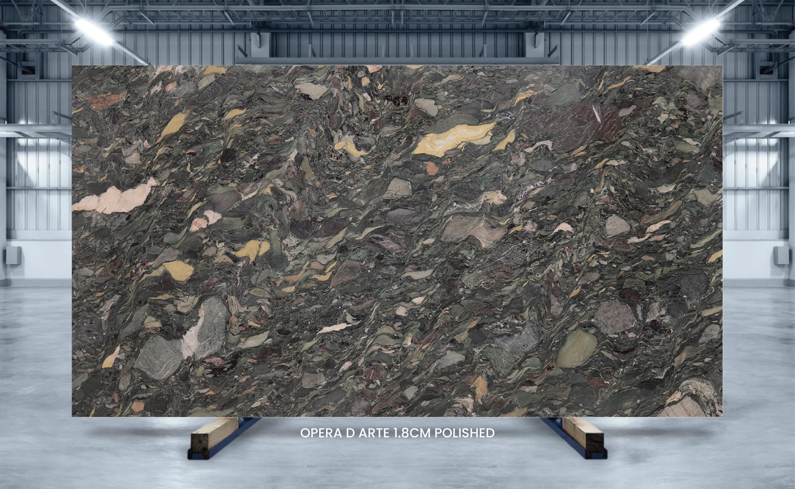 Opera D’Arte is a rare and artistic marble from France. This stunning stone showcases an exotic blend of forest green, pink, black, white, yellow, and purple tones—creating a bold and dramatic effect. Ideal for feature walls, countertops, fireplace surrounds, bar tops, and other decorative interior or exterior accents, Opera D’Arte is a true conversation piece.