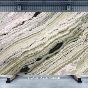 Shangri-La is a premium green marble, quarried in China. It is coveted for captivating veining patterns in shades ranging from mint green to dark green. Furthermore, white, grey, and black angular veins across the slab create a homogeneous yet versatile appearance. Whether you want to create a visually arresting bookmatched accent wall or countertop, this high-end marble can transform any residential and commercial space into a luxurious statement.