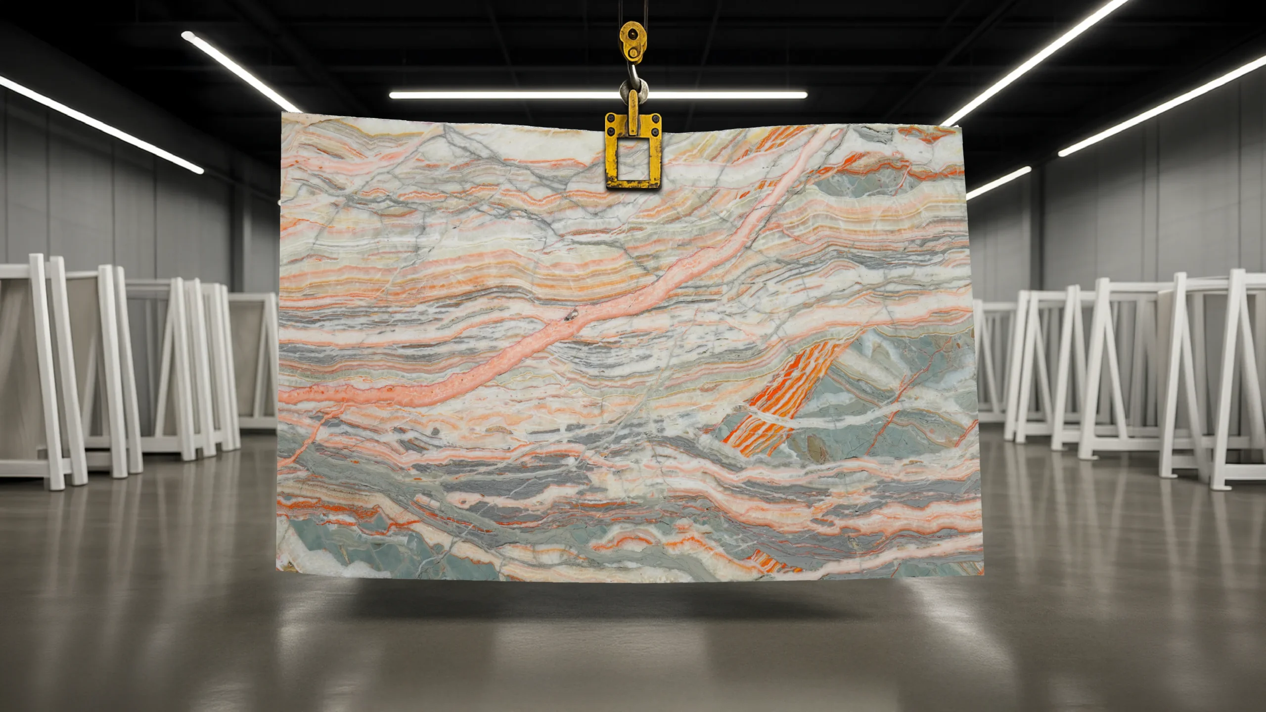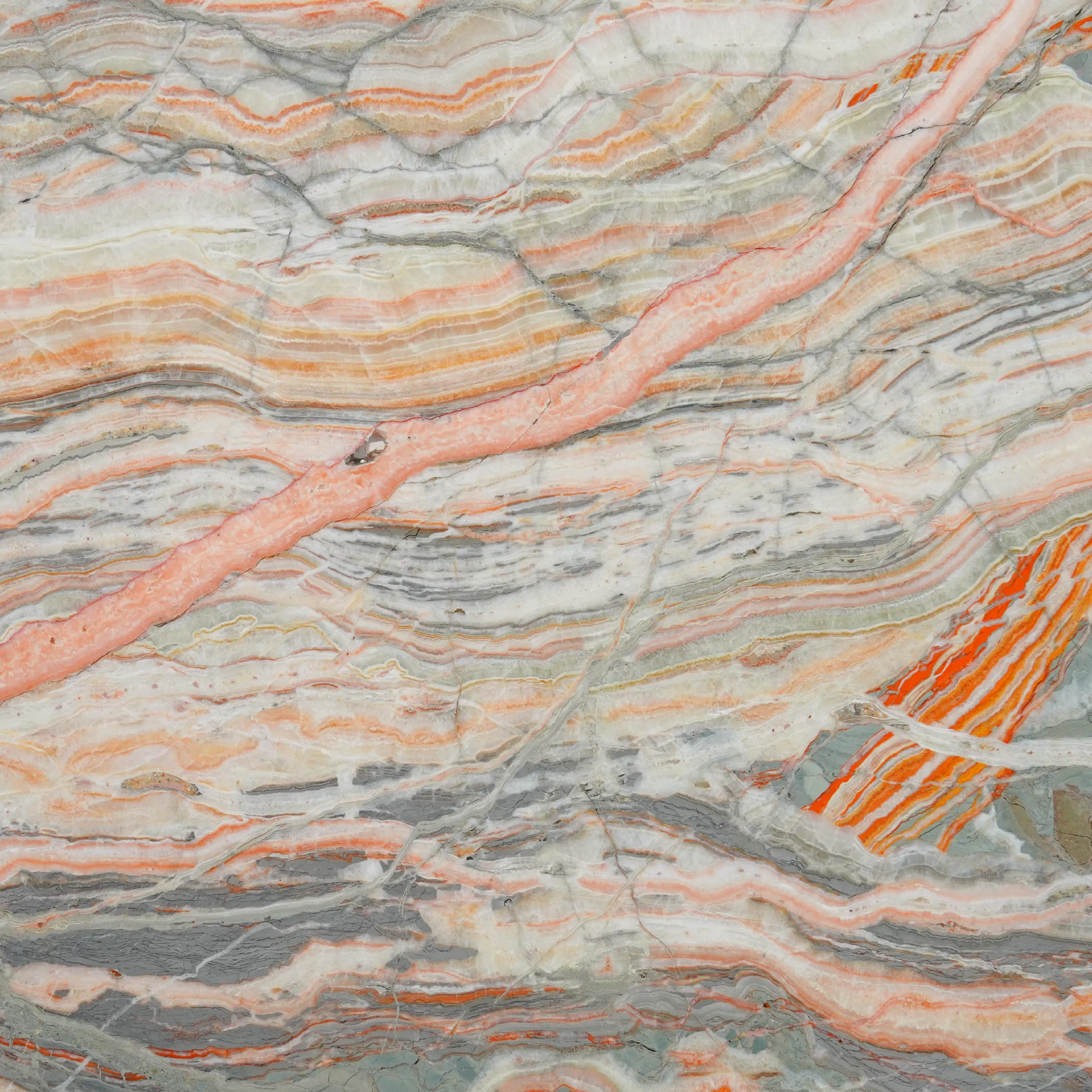Sourced from Italy, Rainbow Onyx is celebrated for its unique patterns. Its orange, green, grey, white, and amber striations create a captivating contrast, adding artistic flair to any setting. This stone is an ideal choice for versatile interior applications, from accent walls to countertops.
