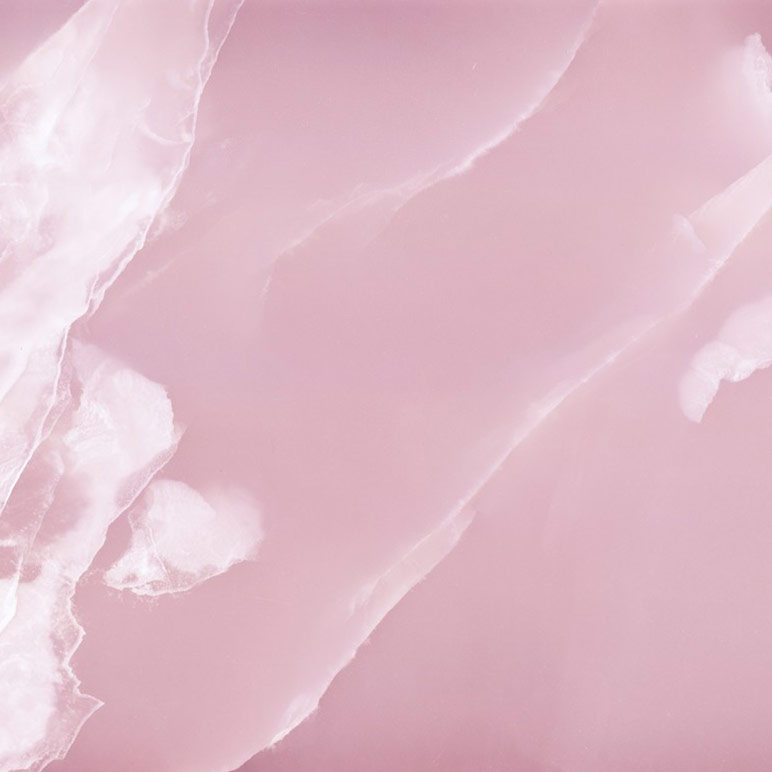 Ruby Onyx is a perfect stone for creating decorative accents. It features a pastel pink background adorned with white veins swirling elegantly across the slab, adding depth and visual movement to its appearance. Whether a bartop or accent wall, backlighting this translucent stone can further enhance its colors and patterns, bathing the space in a soft, ethereal glow.