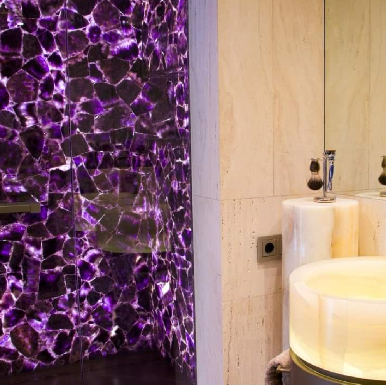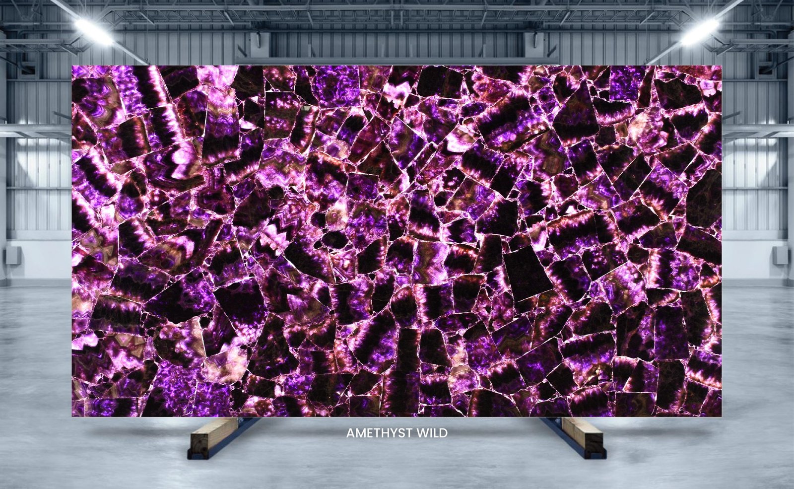 Amethyst Wild precious stone slab is a perfect choice for designing visually striking and functional spaces. It features large amethyst crystals that boast a perfect blend of purple and golden hues. Our Amethyst Wild precious stone can be used to design stunning feature walls, countertops, and other decorative features.