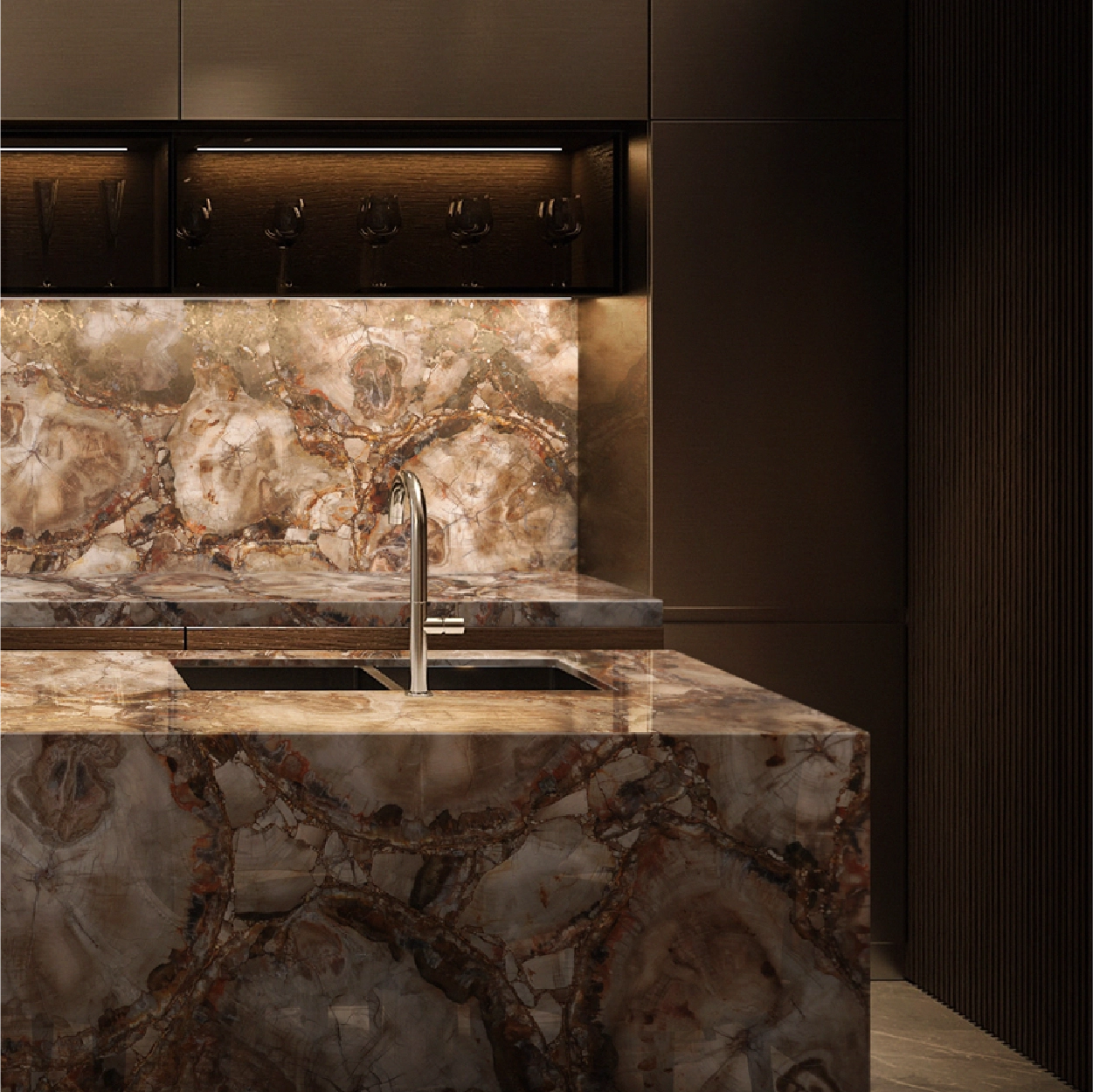 Brown Petrified wood literally is wood turned into stone. Petrifaction is the result of a tree replaced by stone over years of fossilization , some dates back up to 240 million years. these surfaces add a definite class and luxurious look to the room décor.
