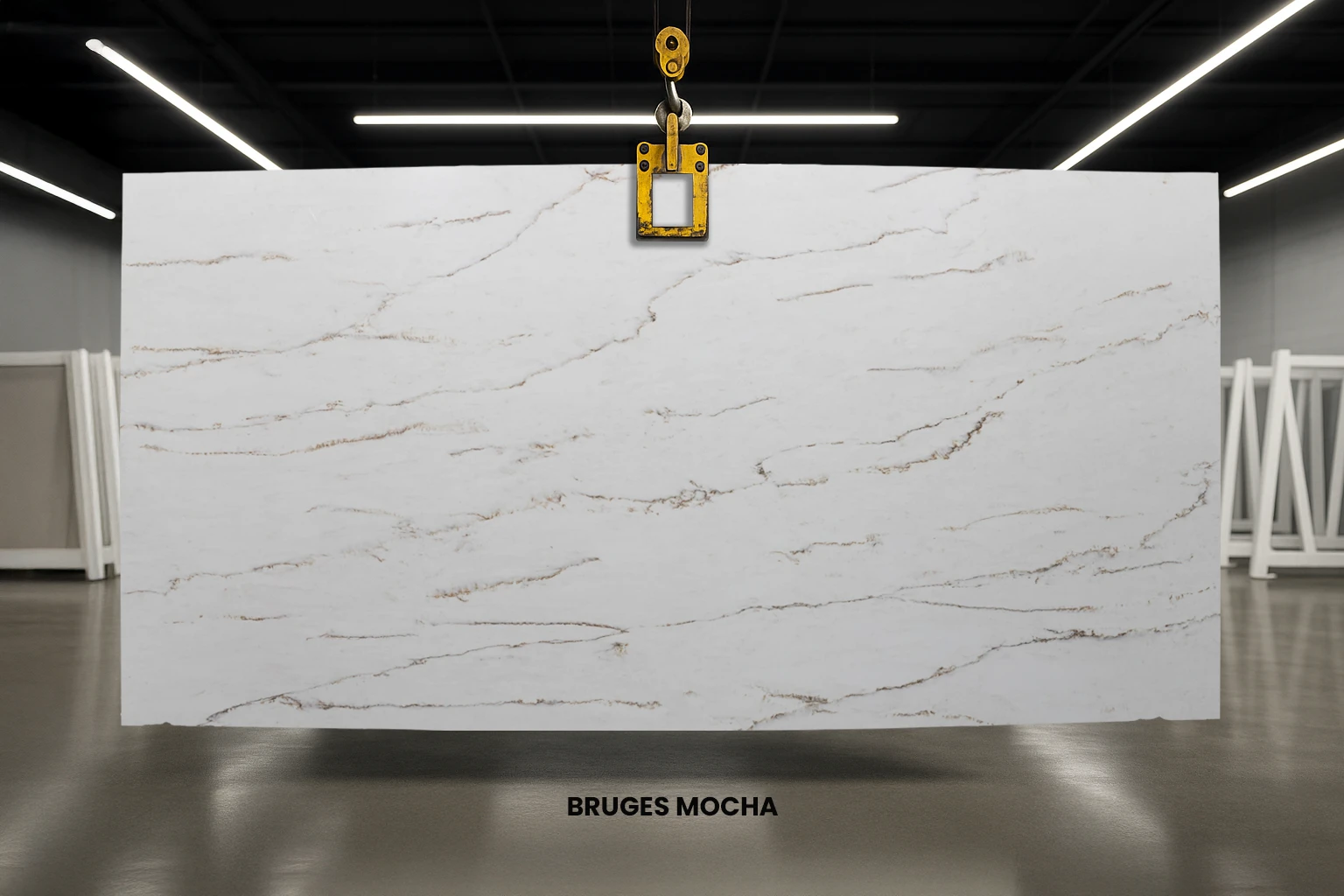 Bruges Mocha Quartz is celebrated for its subtle warmth and exceptional durability. Featuring a pristine white surface accented with delicate grey and golden-brown veining, it effortlessly complements a range of design styles, from traditional to contemporary. Whether used as a countertop or an accent wall, it transforms any space into a statement of refined luxury.