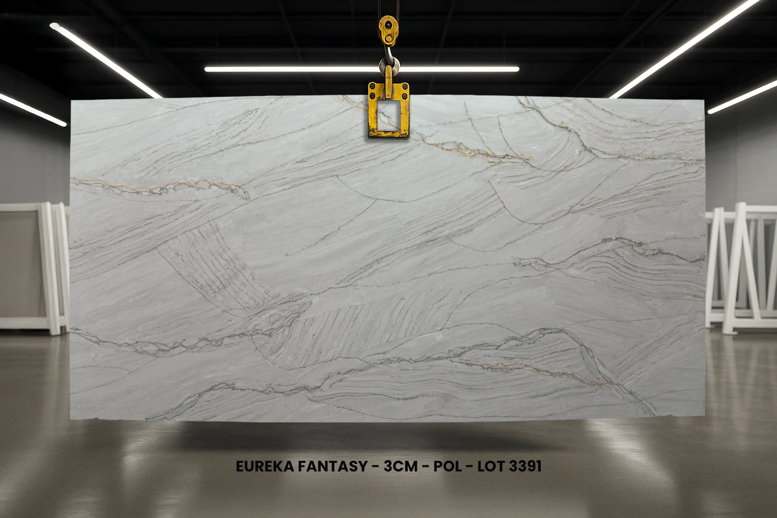 Unleash the dramatic appeal of Eureka Fantasy quartz, a tribute to the mesmerizing beauty of Florida Wave quartzite. Its sweeping grayish blue waves and golden accents create a bold visual impact, perfect for statement interiors. Whether for feature walls, countertops, or artistic focal points, this quartz transforms spaces with a touch of grandeur.