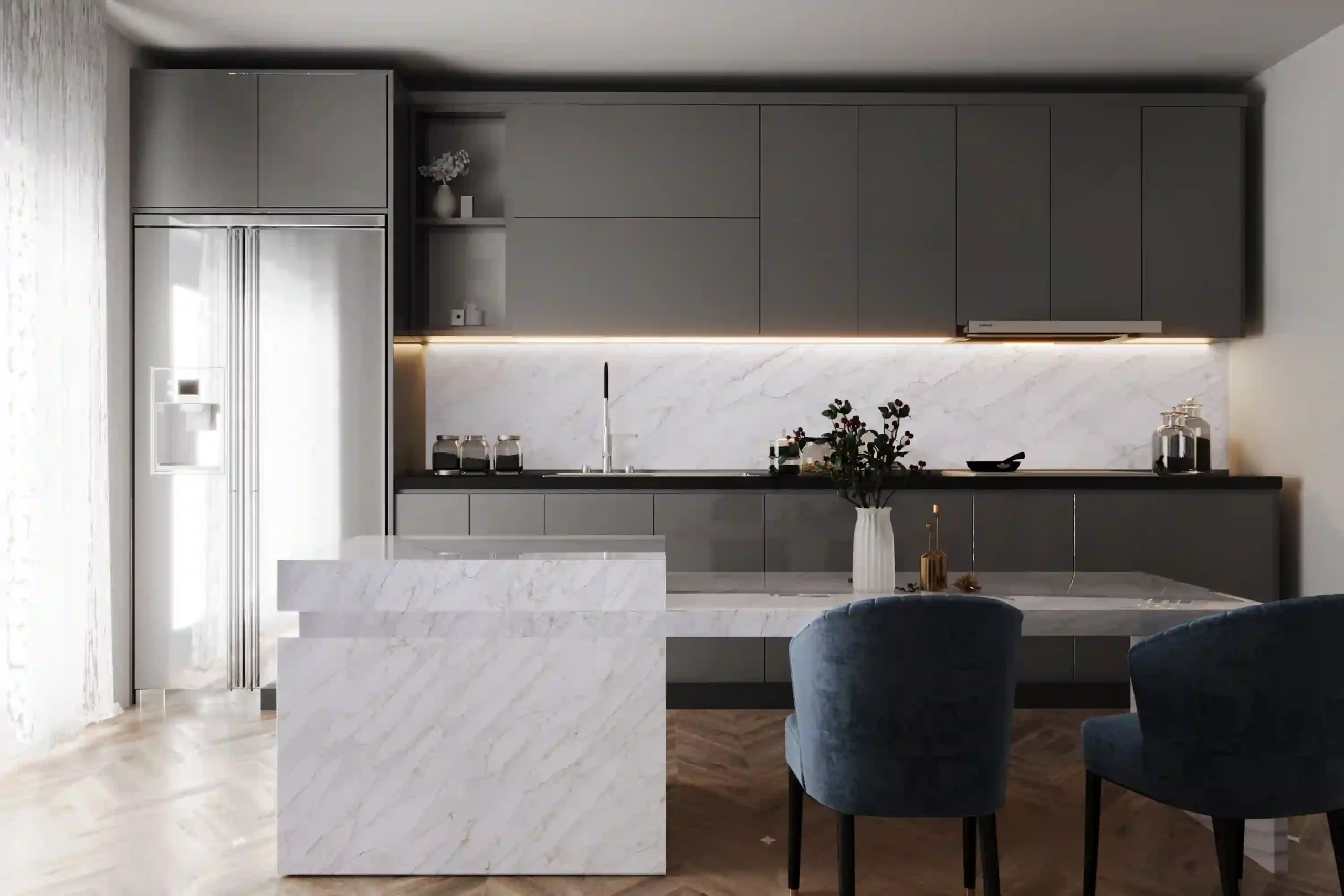 Defined by a gorgeous white background embellished with subtle, brecciated veins, Luccicoso Gold is a sight to behold. The soft grey veins are outlined with golden streaks, adding a touch of elegance and glamor to the stone. Its somber appearance transforms spaces into cozy and inviting retreats. Its enduring durability makes Luccicoso Gold quartz a perfect material to use in high-traffic areas such as living rooms, kitchens and bathrooms.