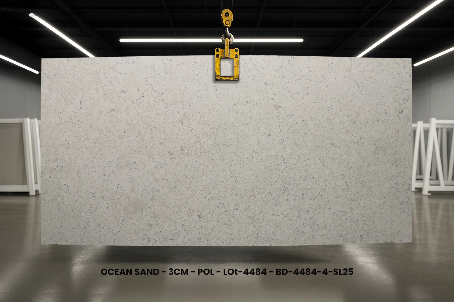 Ocean Sand quartz is a perfect choice for designing residential and commercial spaces. It features a sand-hued surface embellished with small quartz crystals and subtle blue veins, adding an elegant touch to the stone’s appearance. Design high-end and luxurious countertops, islands, floors, and other decorative features with our premium Ocean Sand quartz slabs.