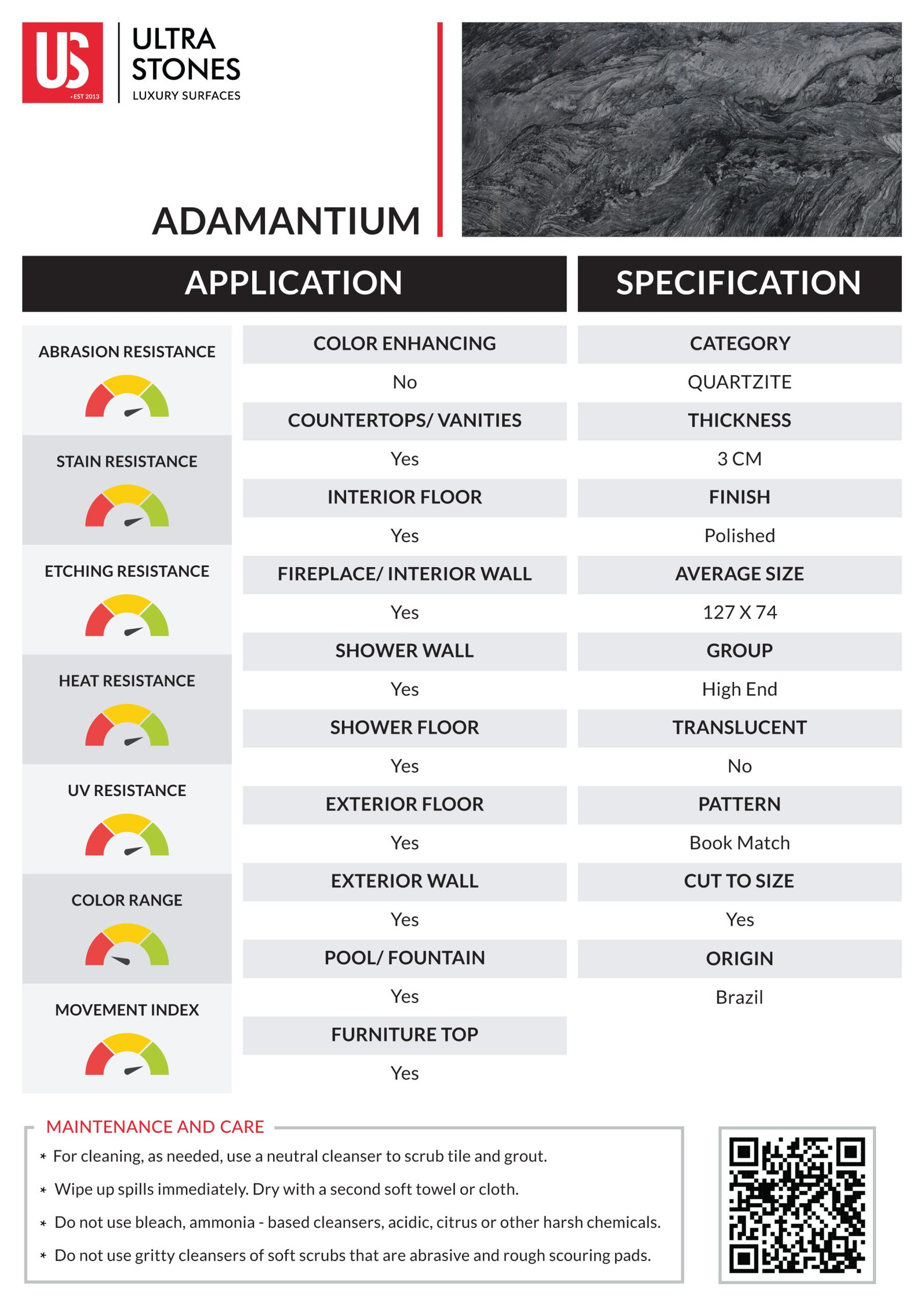 Adamantium is a unique monochromatic quartzite quarried in Brazil. Characterized by a deep charcoal grey background and intricate patterns in light grey or silver tones, this quartzite boasts a moody, captivating contrasting colorplay that can add depth to any interior design style. Its distinct veining patterns carry the spirit of a stormy ocean at night, resembling the majestic swirls of waves. In addition to its natural beauty, Adamantium is a strong and durable quartzite suitable for indoor and outdoor applications alike. Transform your interiors with this exquisite piece of nature.