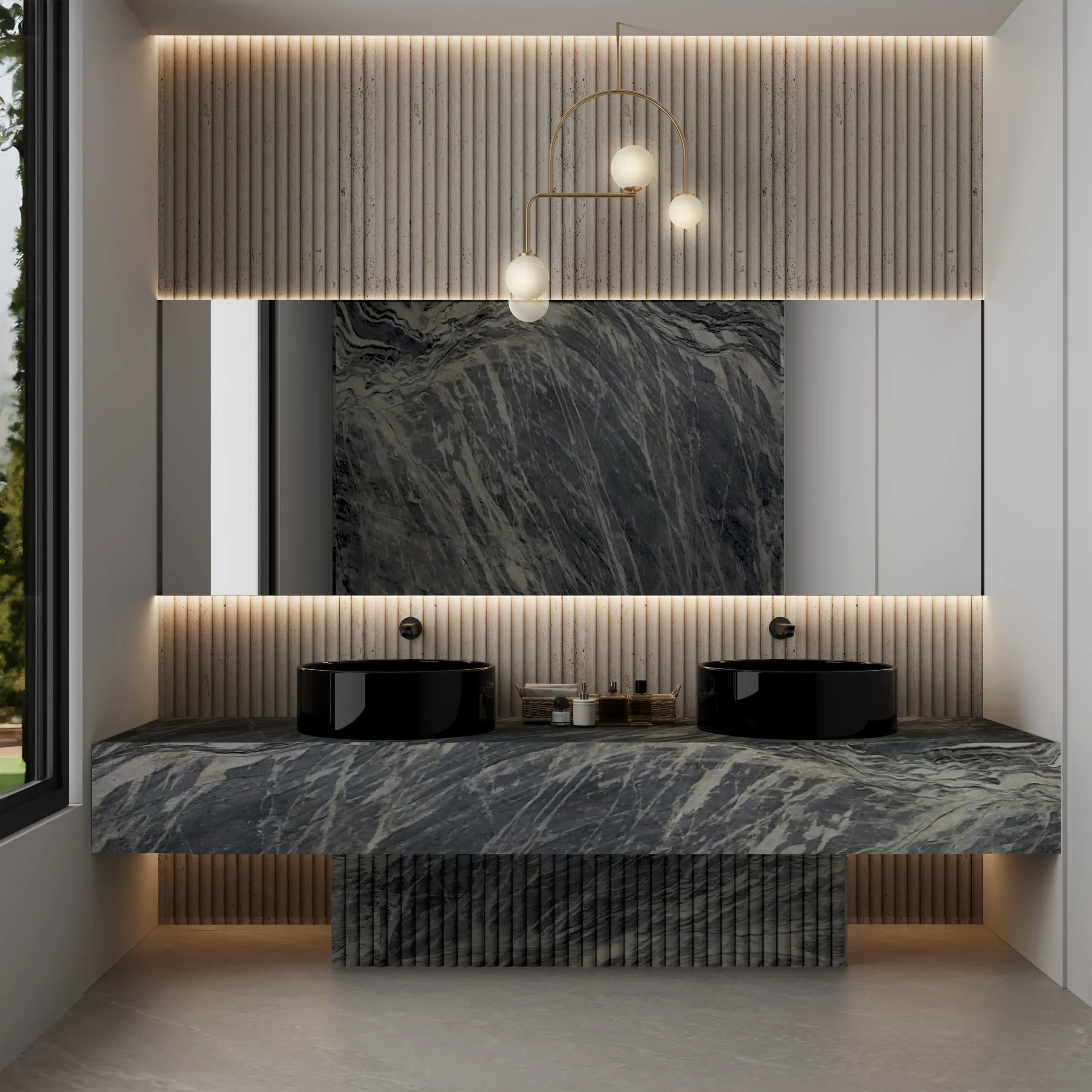 Give your interiors a dramatic flair with the gorgeous Barcelona Blues. The stone is characterized by a deep blue-grey background accentuated by prominent beige veins creating a bold contrast. Create enduring and captivating accent walls, countertops, fireplaces, and staircases with the unfettered spirit of Barcelona Blues quartzite. Quarried in Brazil, this precious natural stone is epitomized by its luxurious look and superior durability.