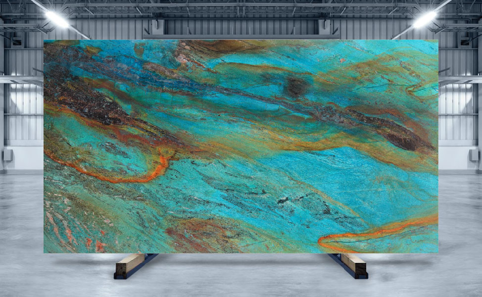 Blue Dream quartzite is a Brazilian gem known for its riot of vibrant hues. Its background flaunts a spectacular blend of blues and greens accentuated by occasional flashes of golden. Bright and Loud, this quartzite demands the attention of everyone in the room, making it a perfect choice for creating captivating accent features in bathrooms or living areas. Its blue-green palette can bring breezy, coastal vibes to the space. Transform your interiors into a tropical heaven with Blue Dream quartzite.