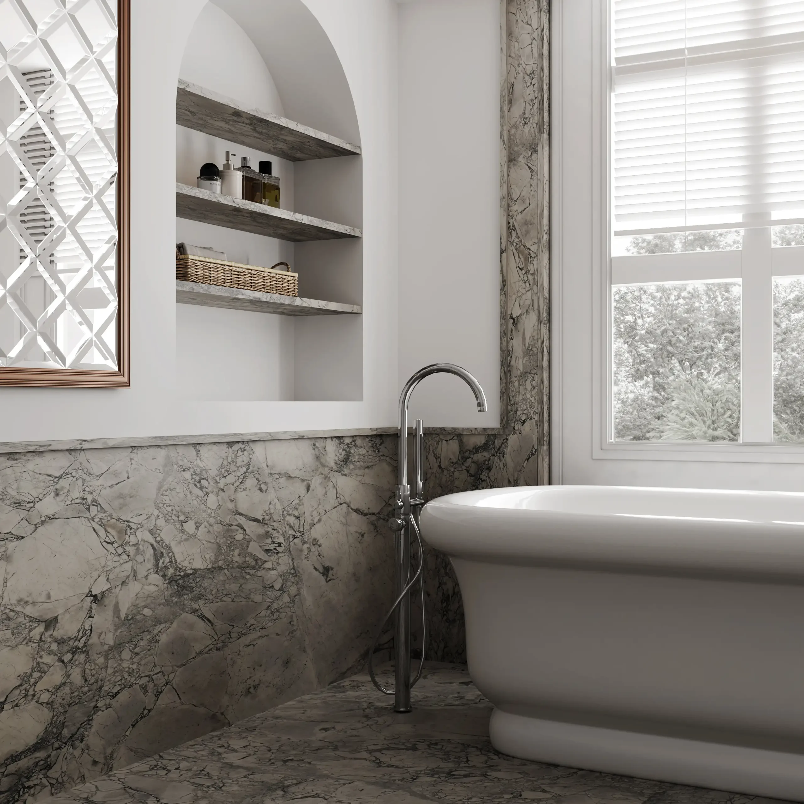 Calacatta Super White quartzite elevates any space with its intricate patterns. Its background displays a classic white and grey palette highlighted by dark grey veins that add visual depth to the stone. The veins, resembling deep rifts, add an organic touch. Whether used for accent walls or flooring, Calacatta Super White quartzite is an ideal choice for introducing pattern and versatility into any design.